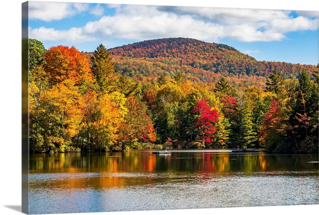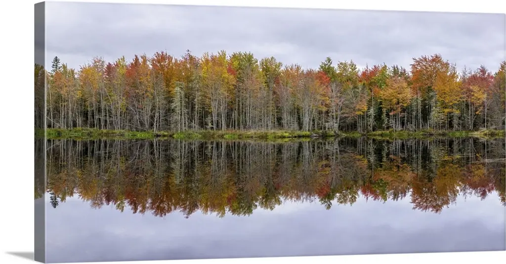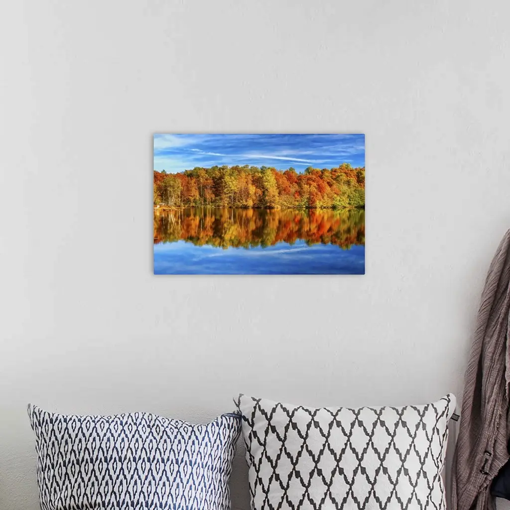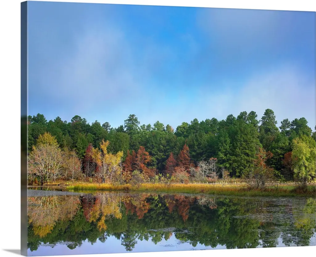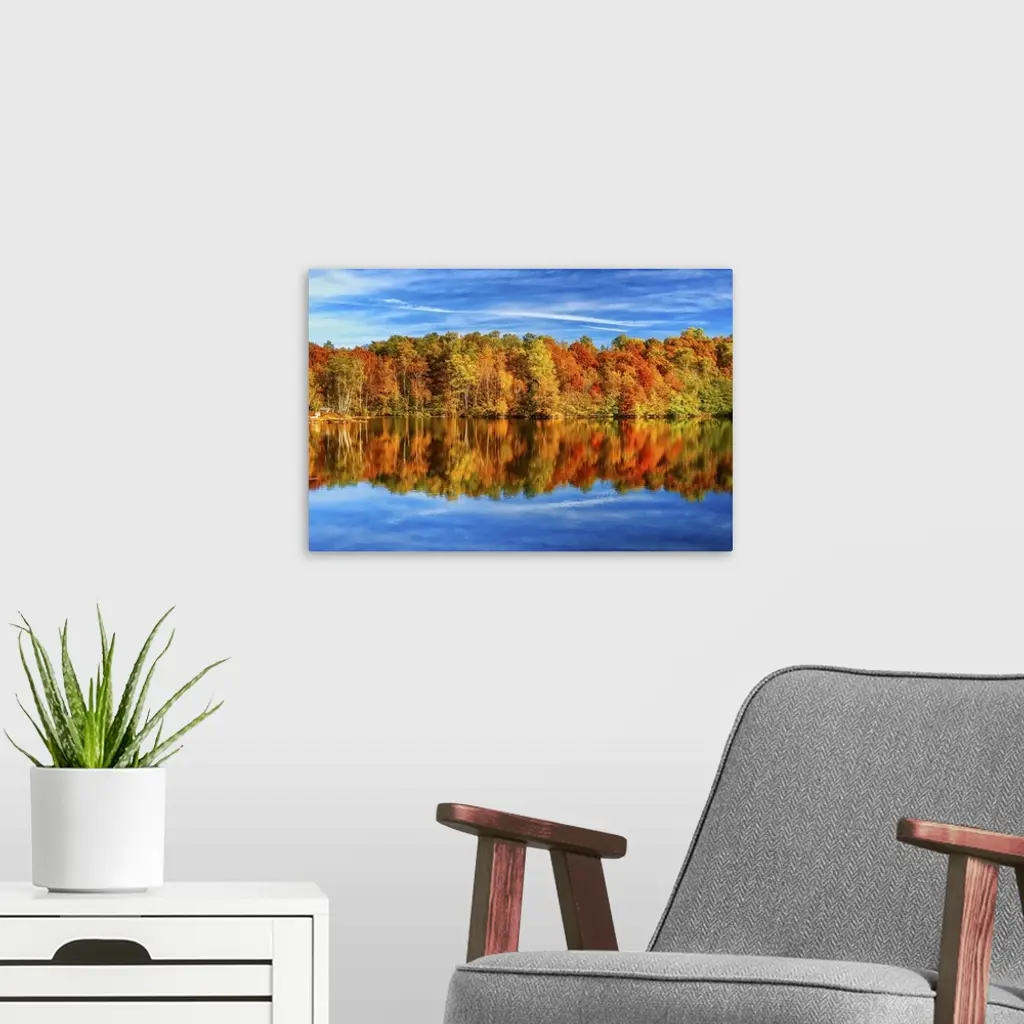 Trees in a variety of fall colors mirrored in a lake with a blue sky above.