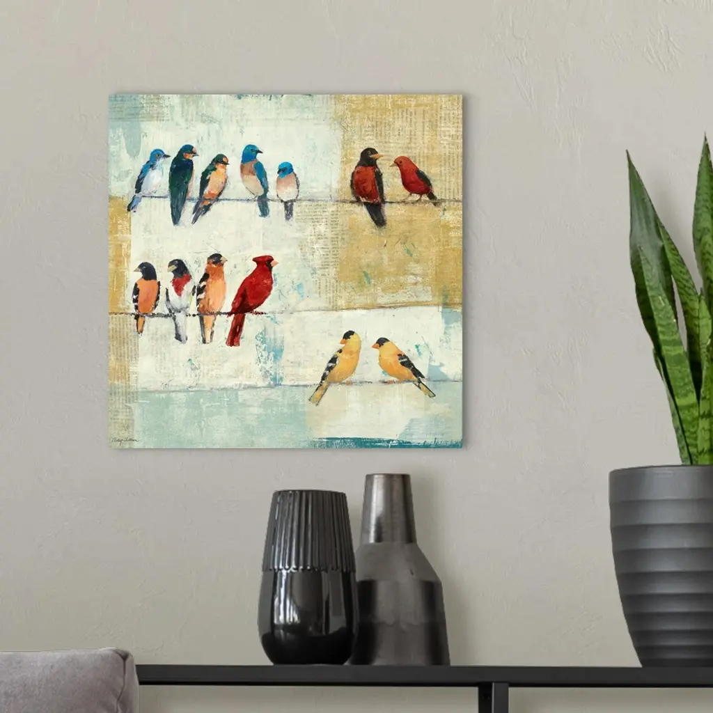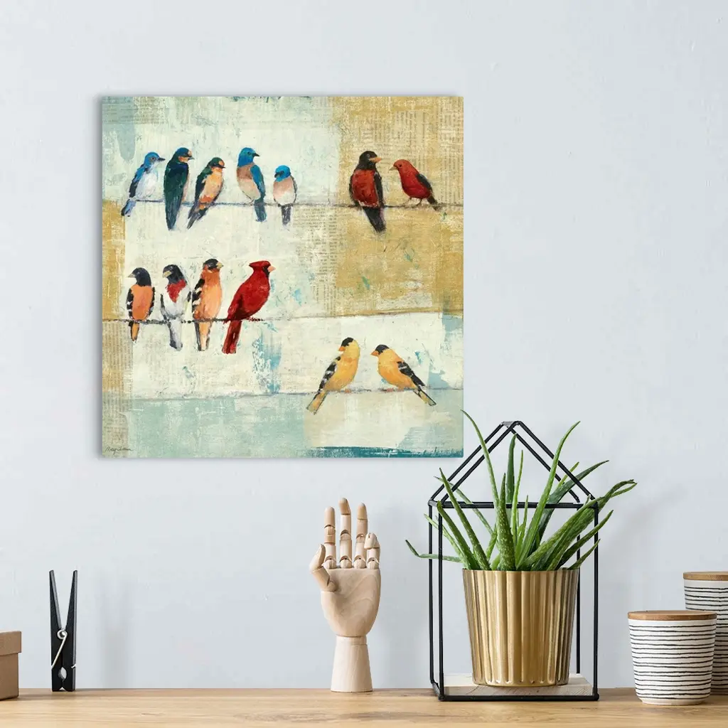 This decorative accent features North American birds, Mountain Bluebirds, Eastern Bluebirds, Barn Swallows, Robin, Scarlet Tanager, Baltimore Oriole, Rose-breasted Gros-beak, Cardinal, and Goldfinches gathered for a line up in front of a mellow and serene textured backdrop created with paint and collaged text.