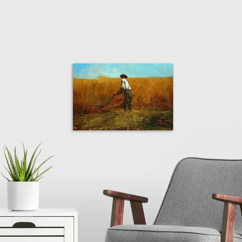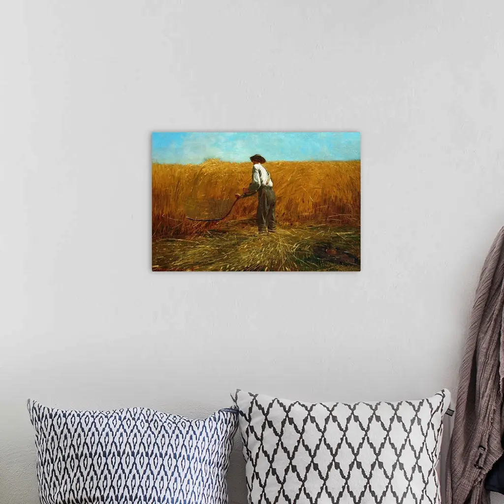 Painted soon after General Robert E. Lee's surrender on April 9, 1865, and President Abraham Lincoln's assassination five days later, Homer's canvas depicts an emblematic farmer, revealed to be a Union veteran as well by his discarded jacket and canteen at the lower right. His old-fashioned scythe evokes the Grim Reaper, recalling the war's harvest of death and expressing grief at Lincoln's murder. A redemptive feature is the bountiful wheat-a northern crop-which could connote the Union's victory. Referring to death and life, Homer's iconic composition offers a powerful meditation on America's sacrifices and its potential for recovery.