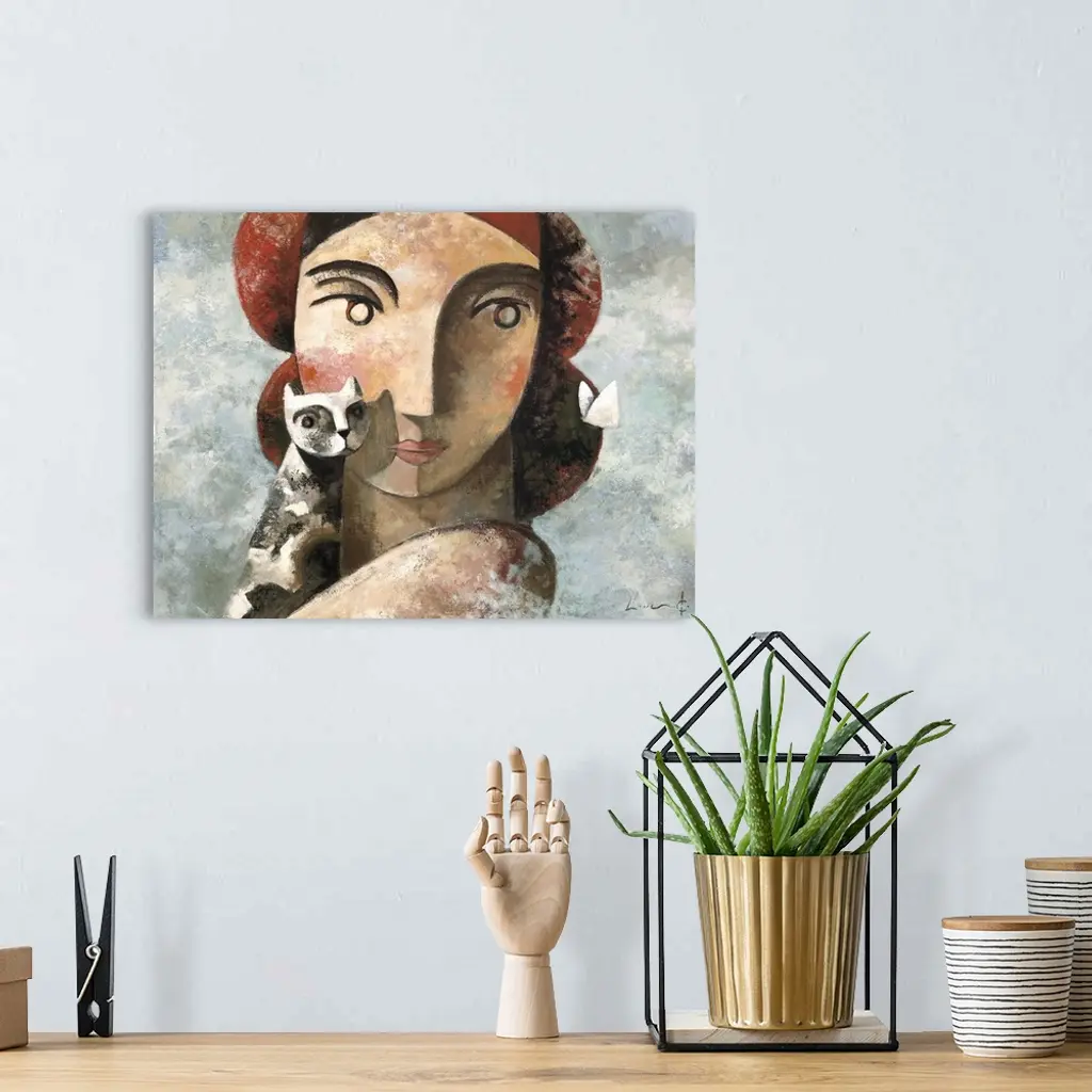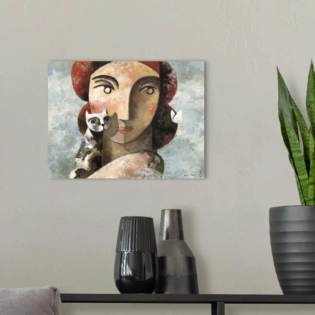 A horizontal portrait of a woman holding a cat while a white butterfly passes by, painted in a cubism style.