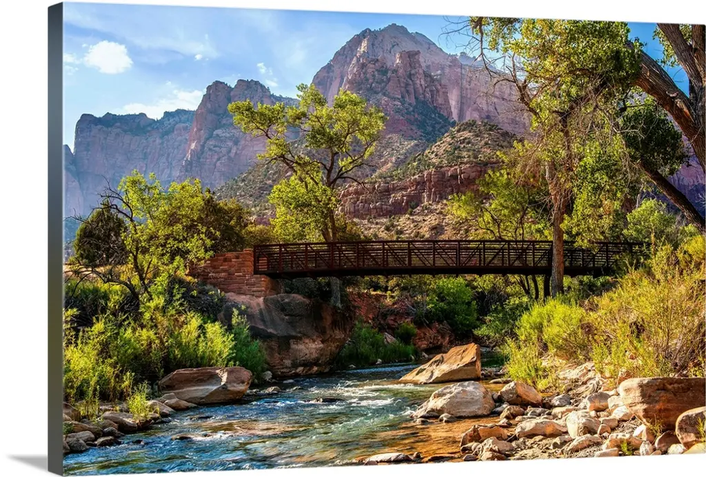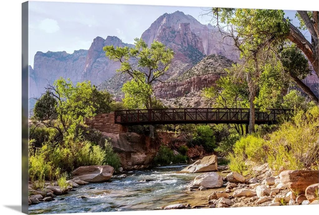 View of 'The Watchman' peak with Virgin River from Canyon Junction Bridge, Zion National Park, Utah.
