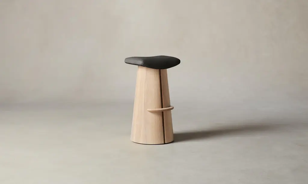 A contemporary interpretation of a classic saddle stool, the Weston has a contoured seat and sculptural base with a slit down the center that welcomes a whisper of light to stream through. Handcrafted at a family-owned workroom in upstate New York.