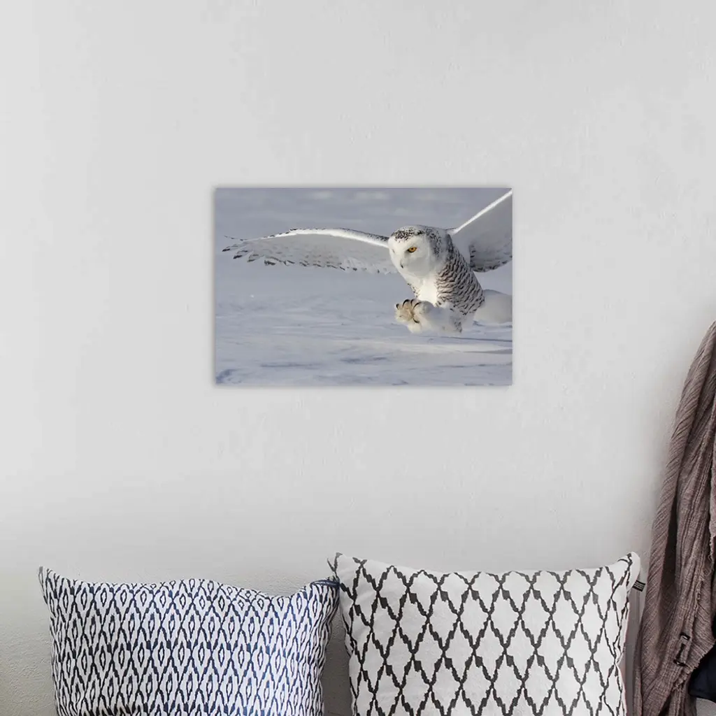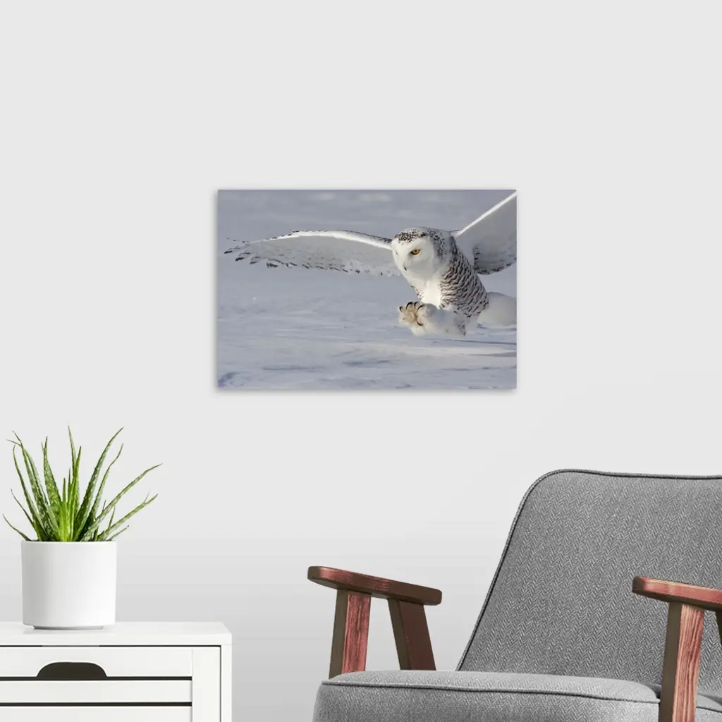 An owl touches down with its talons open wide ready to catch its prey.
