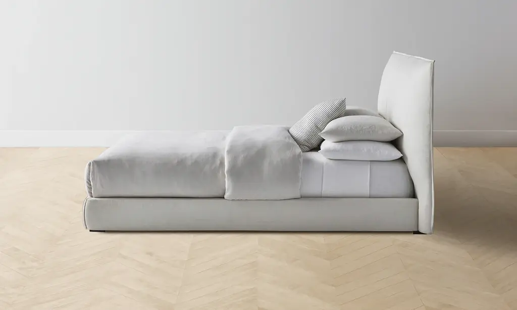 The Wythe Bed achieves a perfect balance of ease and sophistication. It features a laid-back, low profile and extended headboard traced with flange seams. Handcrafted in North Carolina.