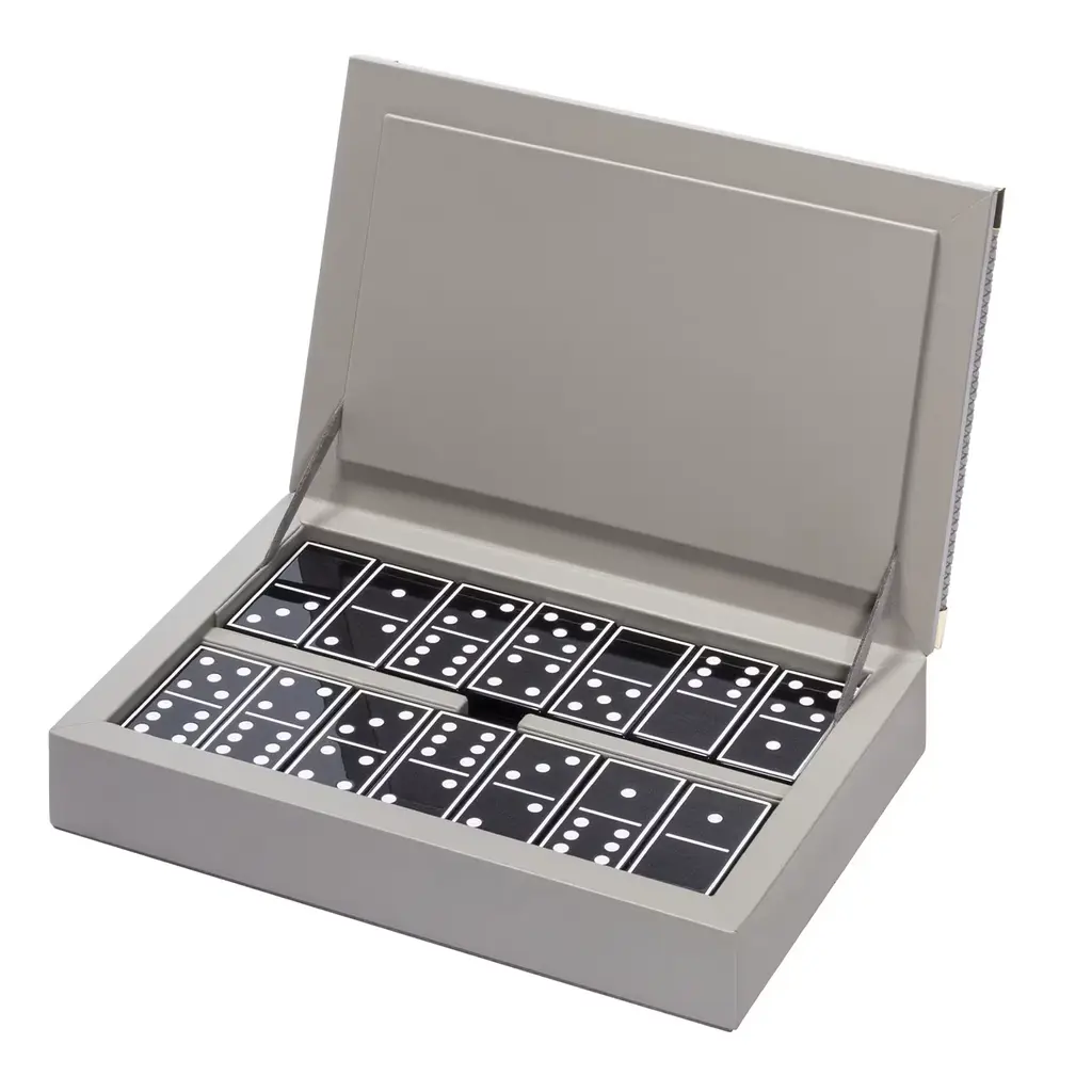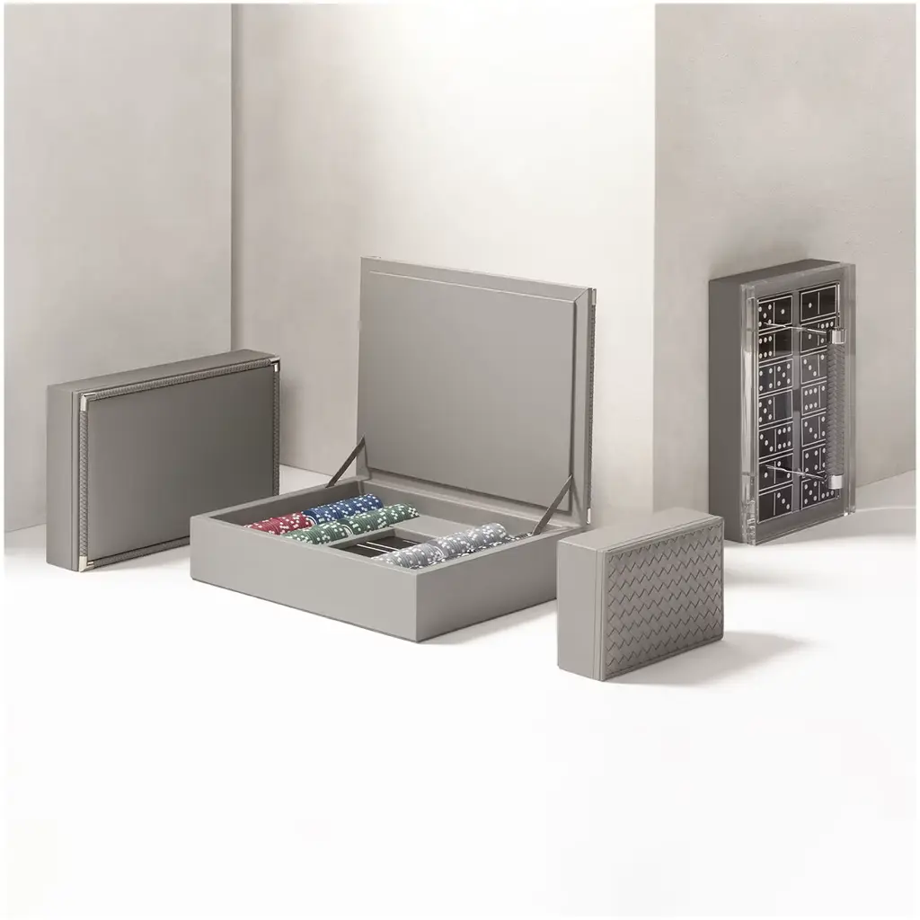 Leather box with braided leather trim and chrome or gold metal details. Set equipped with highly resistant glossy plexiglass domino pieces: choose between black or white finish.