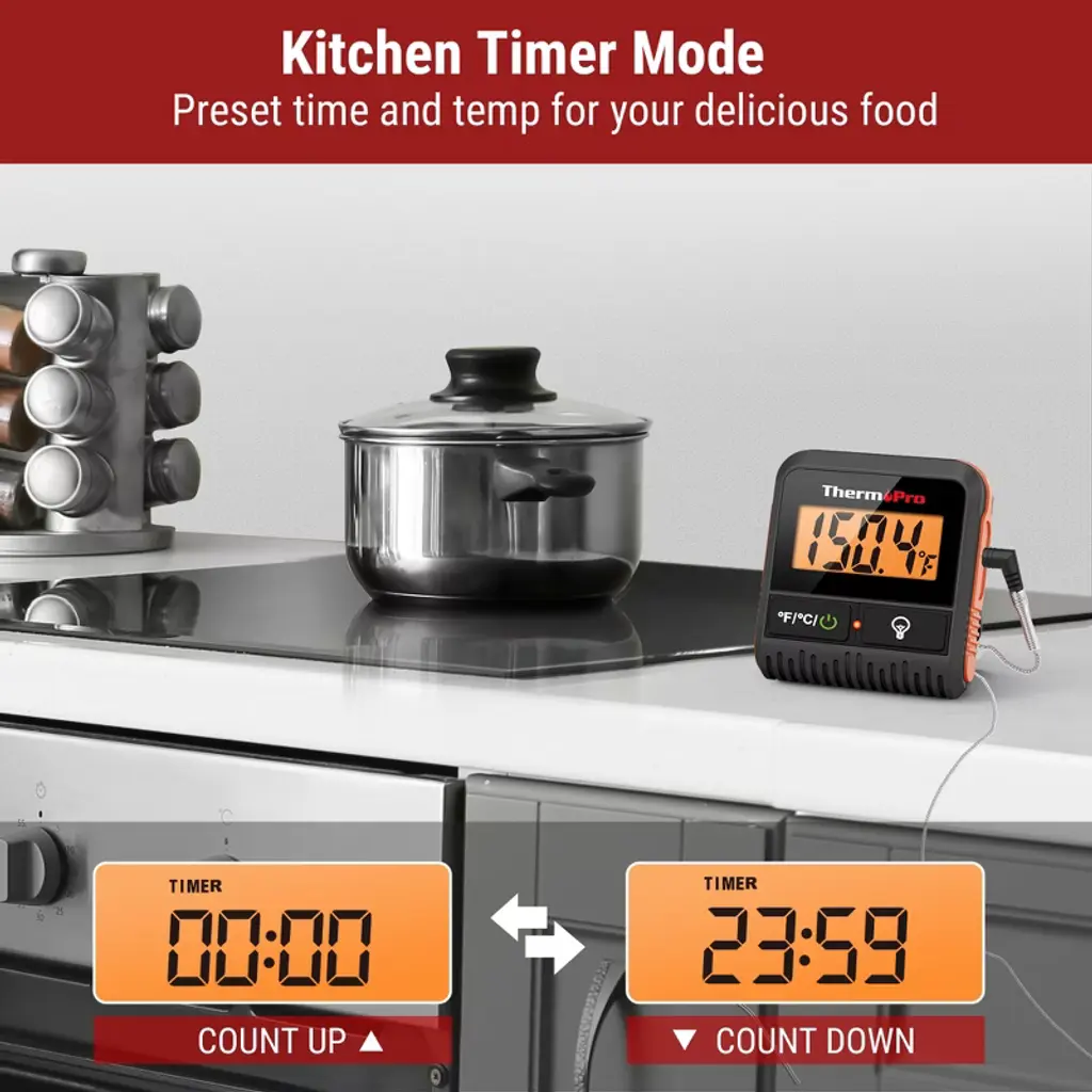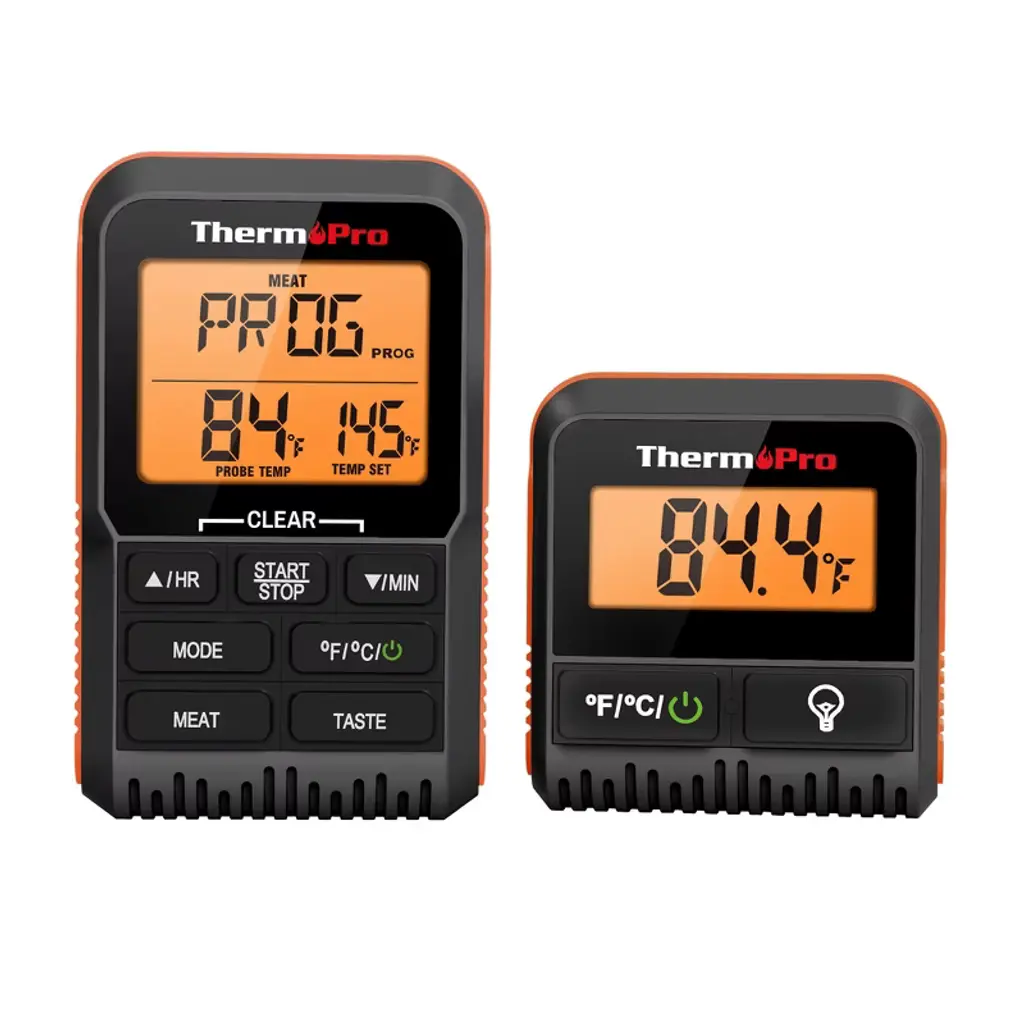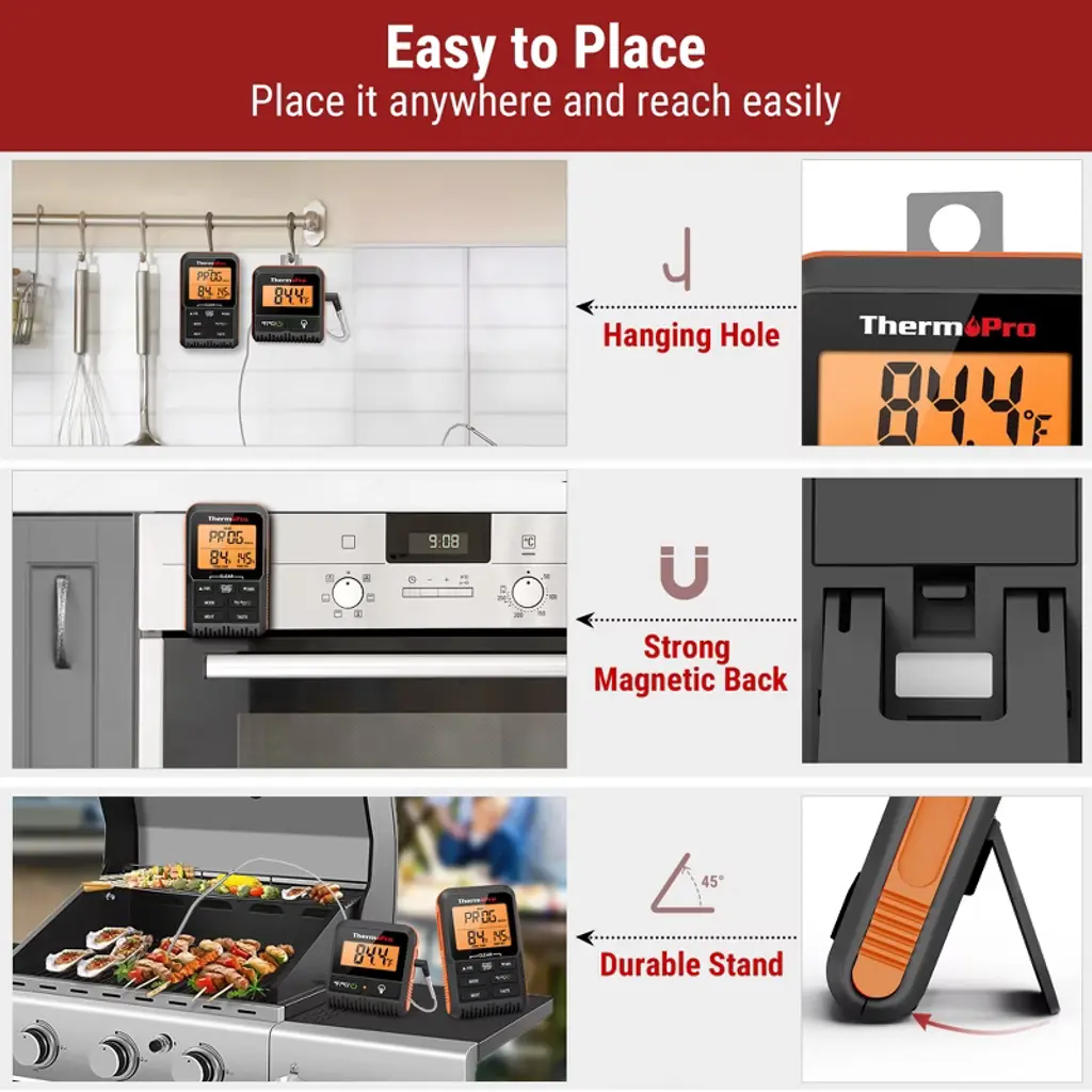 The ThermoPro TP806BW Digital Meat Thermometer with Probe is the ultimate device for accurate and remote monitoring of your meat's temperature. Say goodbye to the constant indoor-outdoor shuffle just to check your meat. Instead, embrace convenience as you supervise the cooking from a remarkable distance of 500 feet! This wireless grilling meat thermometer doesn't just offer an audio alert. It also boasts a sleek design, combining functionality and style, thus enhancing your cooking experience while also keeping you updated on your cooking progress continuously.