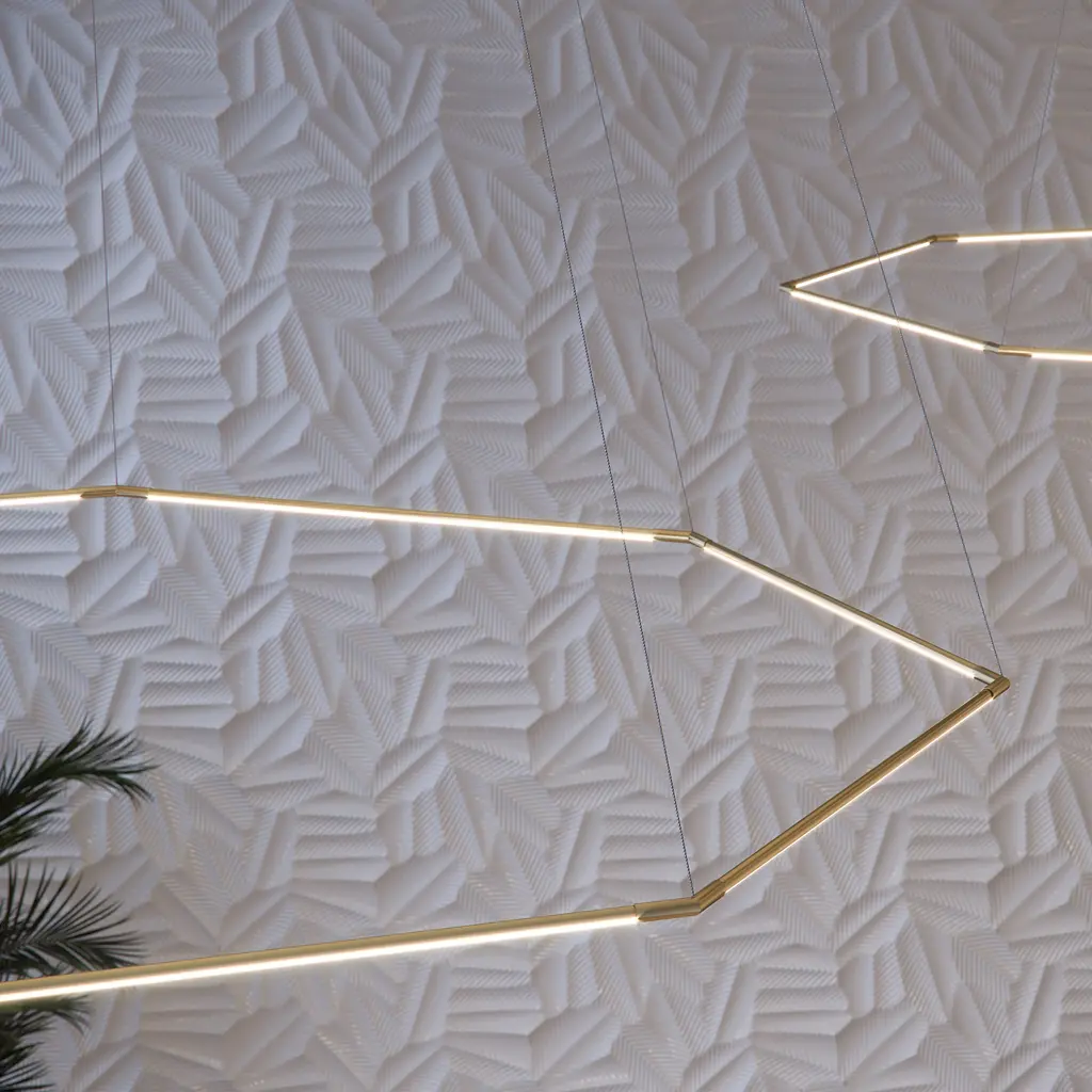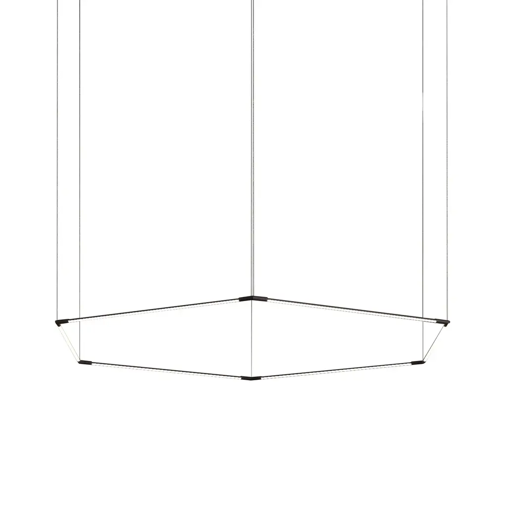 This geometric shape is a stunning variation on Peter Butler’s signature Thin Primaries lighting system for Juniper Design. Available in either suspended or wall-mounted options, it creates a mesmerizing silhouette while still providing functional lighting for commercial, residential or hospitality settings. Individual fixtures can be clustered, expanded or interlocked to easily create custom installations with its fully rotatable light segments and magnetically connecting ends.