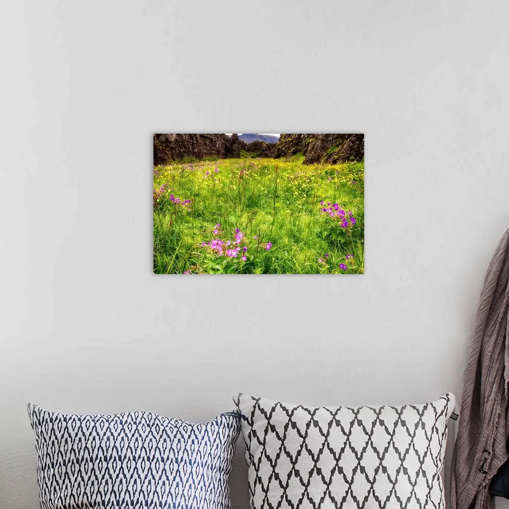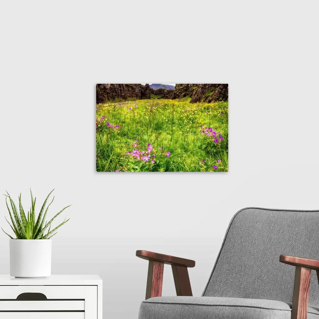 Low Angle View of a Medow in a Fault with Blooming Wildflowers, Thingvellir National Park, Iceland