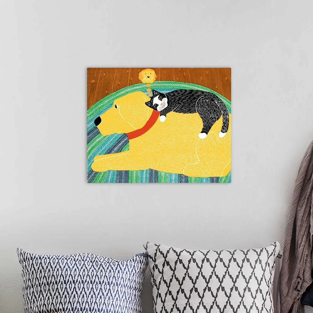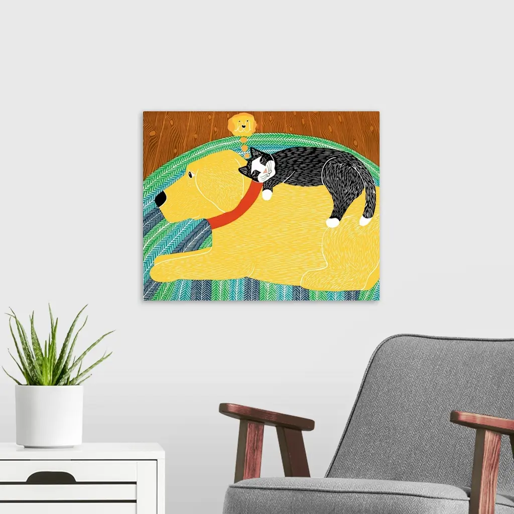 Illustration of a black cat napping on a yellow labs back dreaming of the dog while the dog lays wide-eyed.
