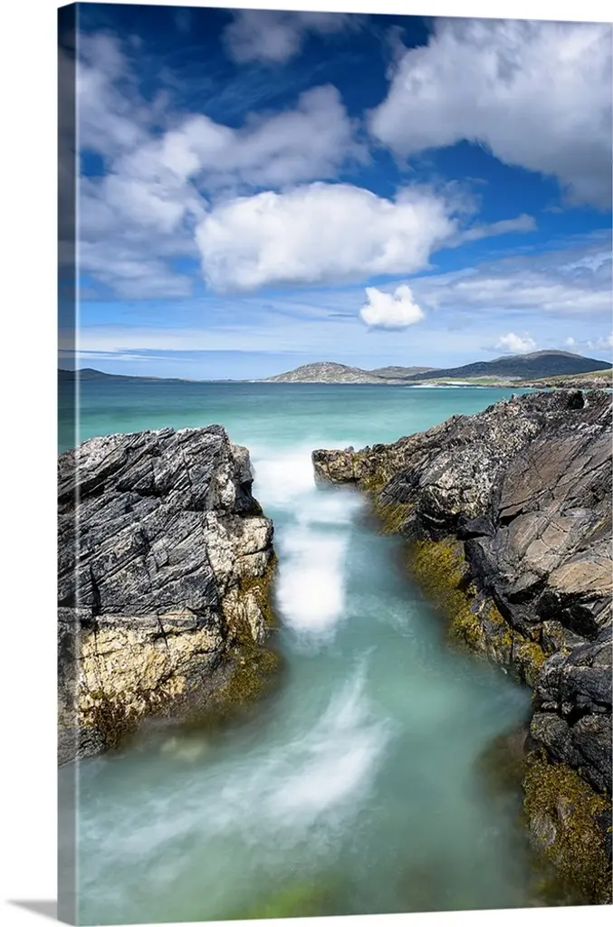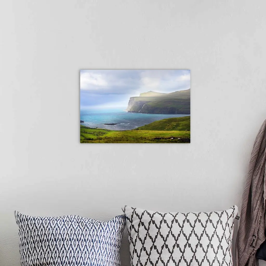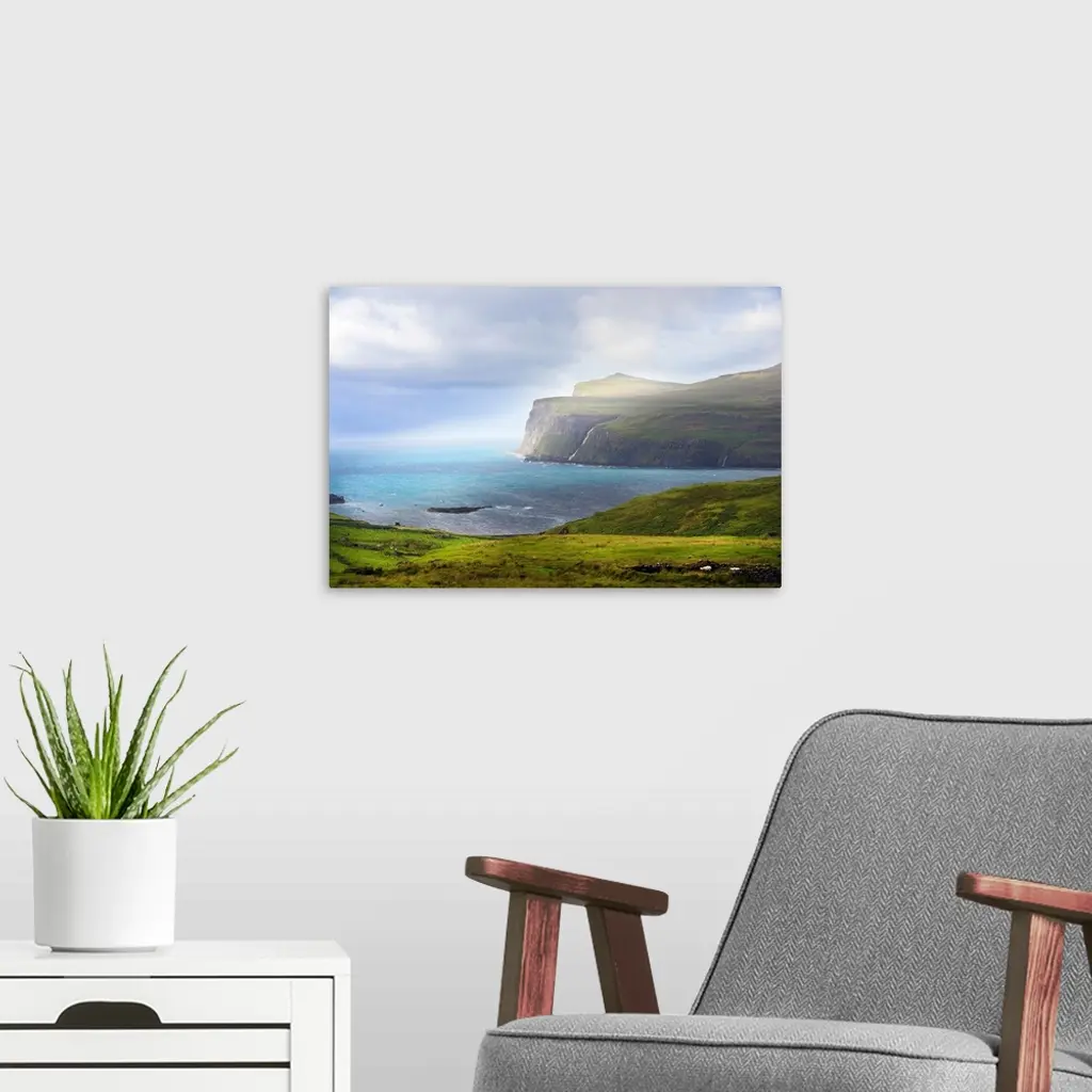 Fine art photo of cliffs at the edge of the sea under bright sunlight.