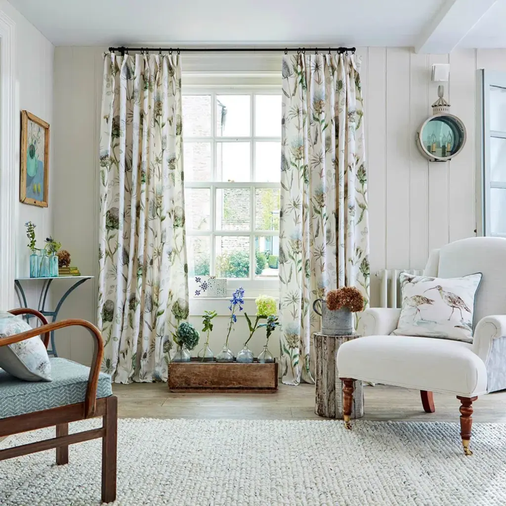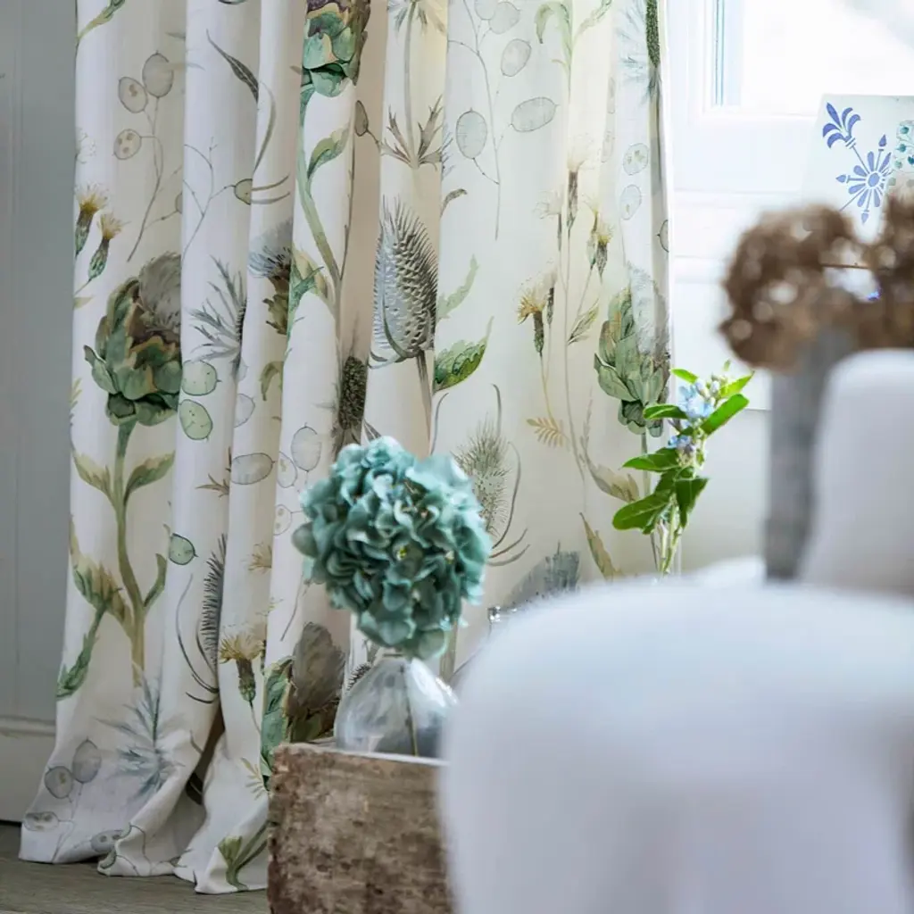 This enchanting cotton-linen mix fabric design portrays strong thistle shapes alongside delicate seedpods and is punctuated by lively bursts of color.