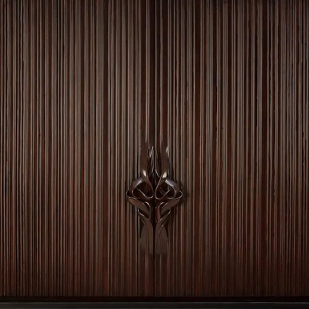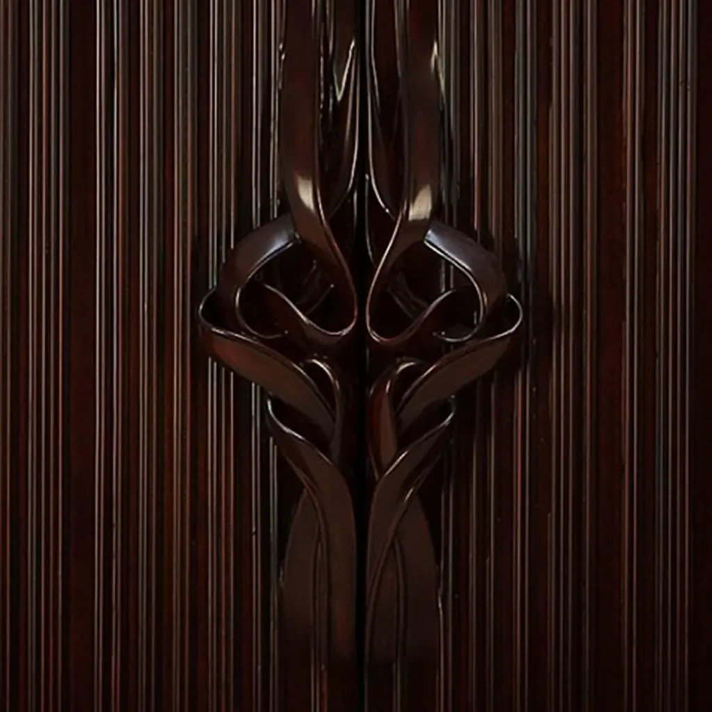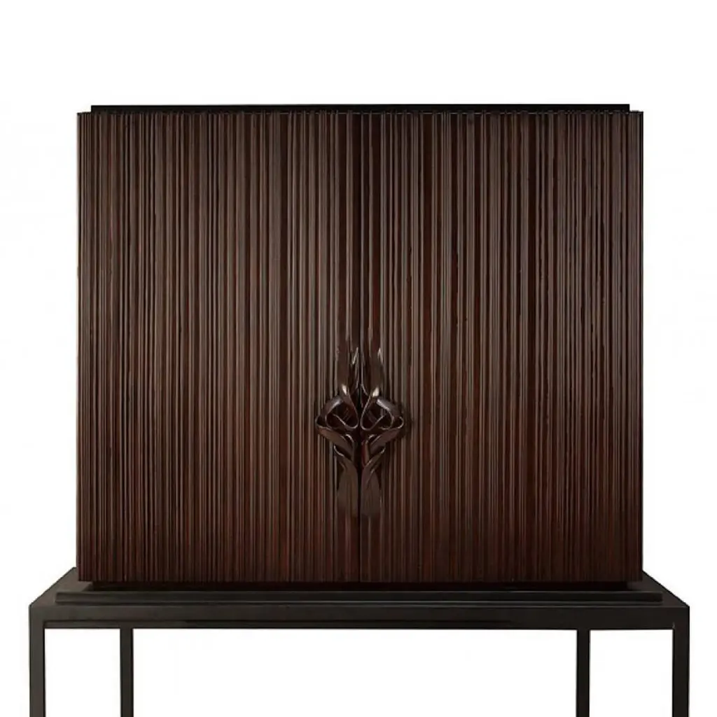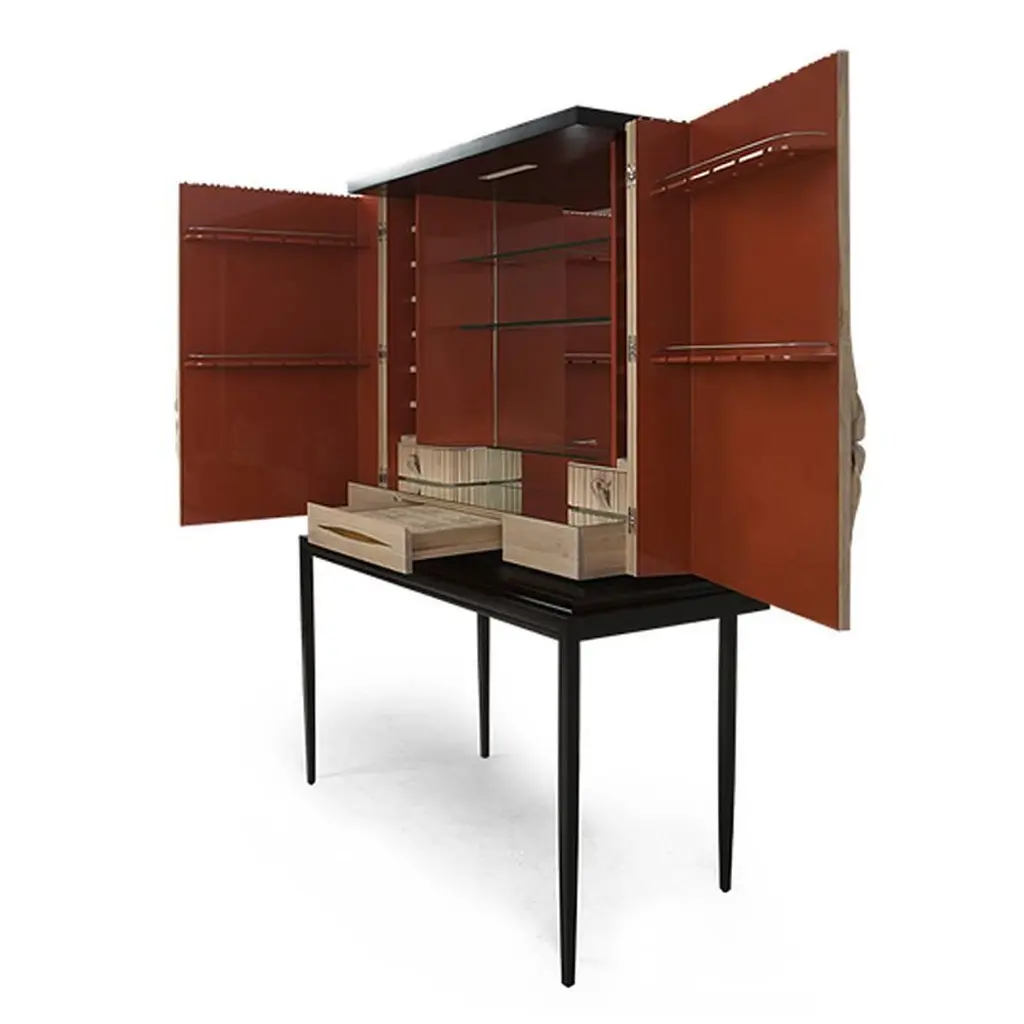 Bar Thomas with structure in solid mahogany wood,totally hand-crafted, hand-carved wood. Base in blacksatin solid wood. Inside in coral lacquered solid woodmahogany. With inside back in mirror glass, two drawersin handcrafted coral lacquered mahogany wood andtwo shelves in mirror glass. With 14 bottles range insideeach side. Exceptional piece.