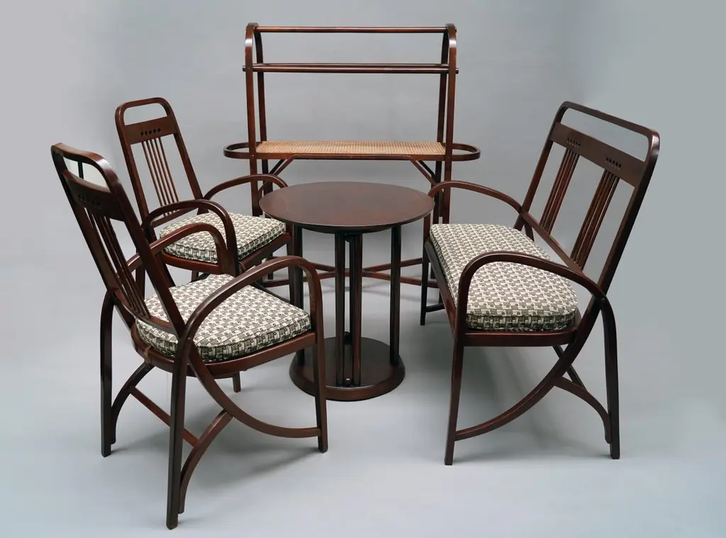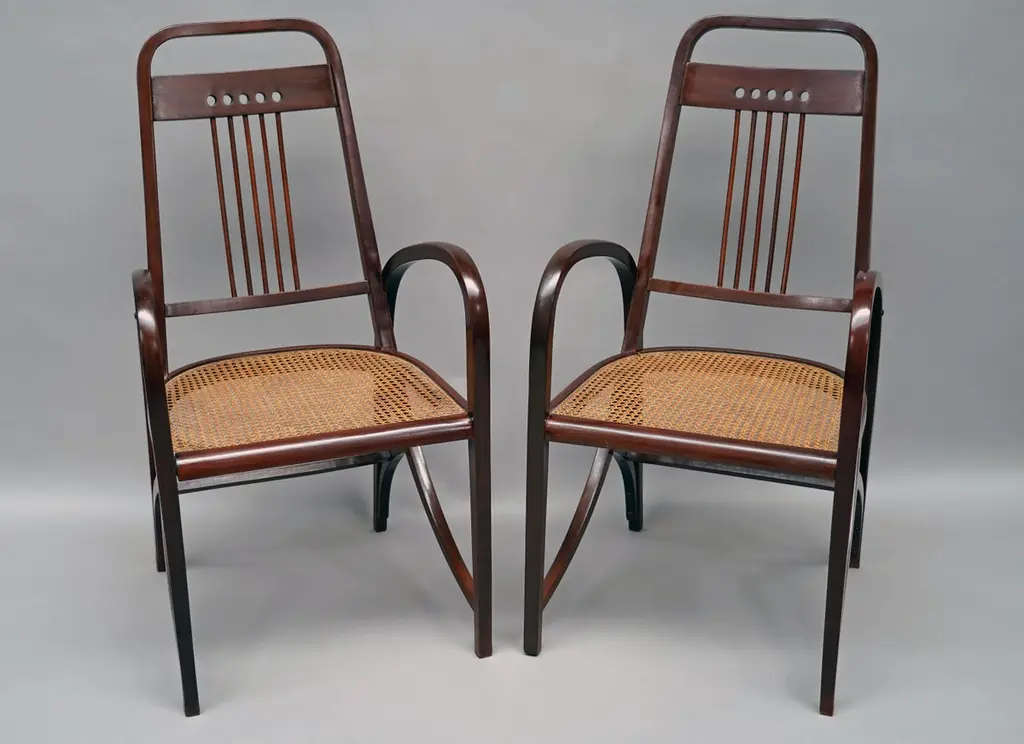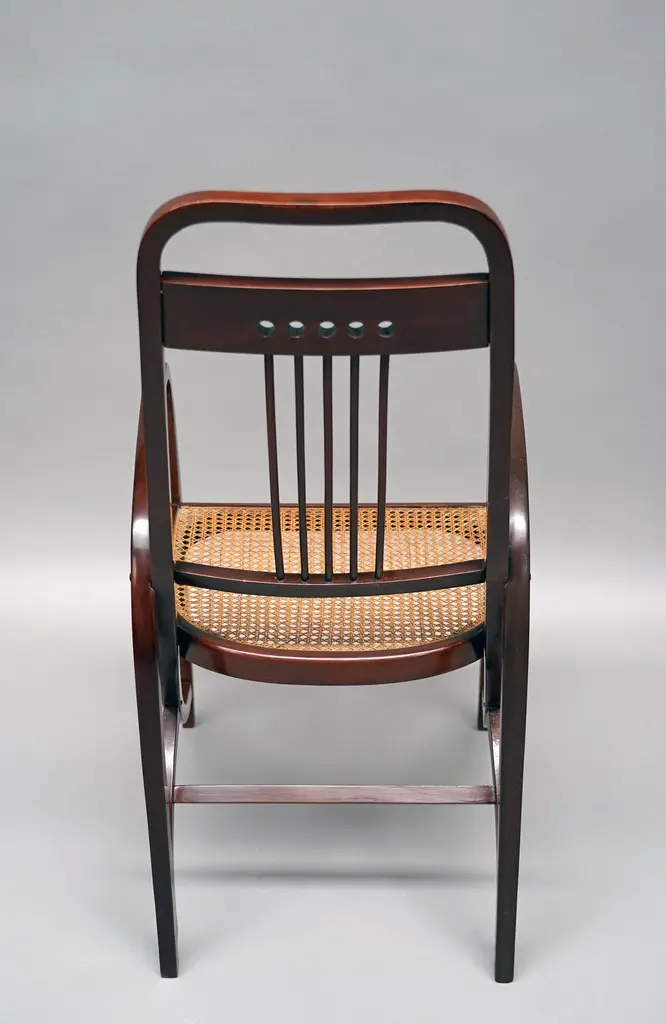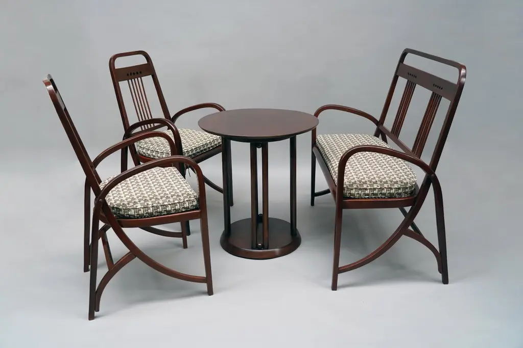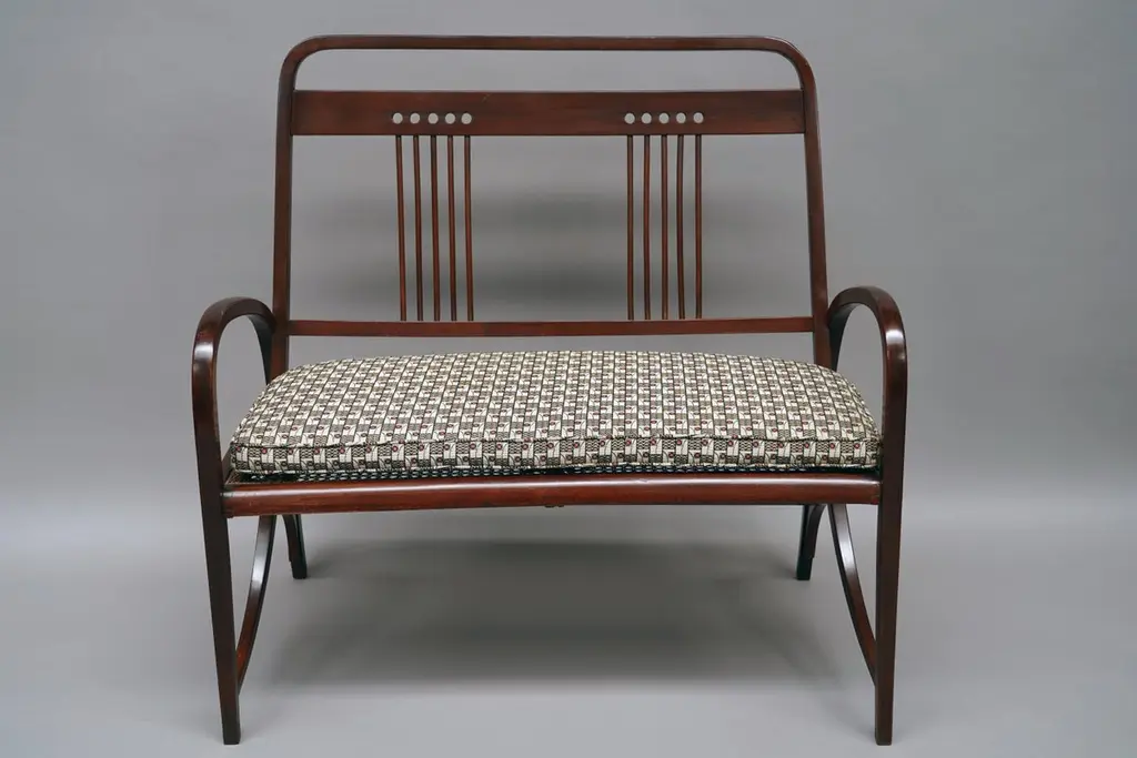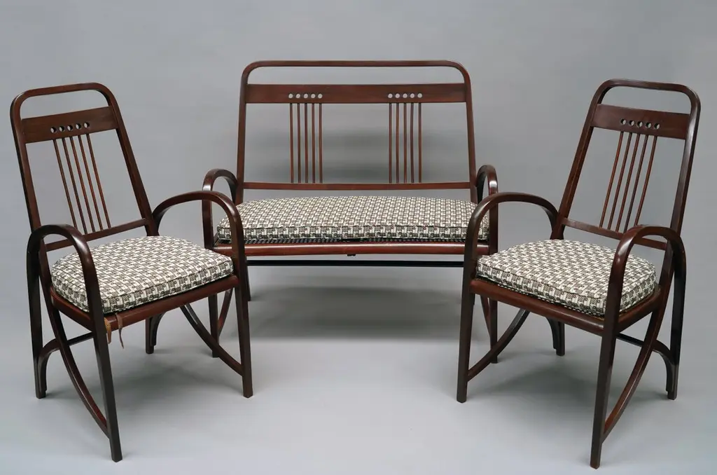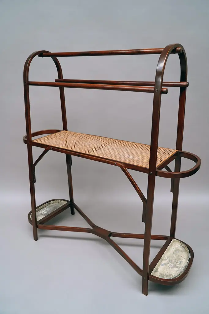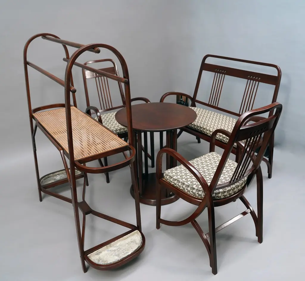 Stamped and bearing the label THONET WIENArmchairs – Height : 106 cm (41,7 in.) ; Width : 54,5 cm (21,5 in.) ; Depth : 55 cm (21,7 in.)Sofa – Height : 106 cm (41,7 in.) ; Length : 105,5 cm (41,5 in.) ; Depth : 53,5 cm (21 in.)Gueridon – Height : 74 cm (29,1 in.) ; Diameter : 65,5 cm (25,8 in.)Jette-habits – Height : 137 cm (53,9 in.) ; Length : 130 cm (51,2 in.) ; Depth : 44 cm (17,3 in.)Elegant salon set in curved wood and cane, composed of two armchairs, a sofa, a gueridon and a jette-habits. The armchairs and the sofa have openwork backs decorated with five circular perforations and five vertical bars, and a geometric patterned cushion covers the seat.The jette-habits is made up of three upper crosspieces in the shape of a humpback, an intermediate cane shelf extended by umbrella stands at the ends, and finally, a base ending in metal trays used to collect water from umbrellas or rain clothes.They are accompanied by a gueridon designed by Josef Hoffmann and Gustav Siegel, with a circular top and base connected by four uprights formed of double columns separated by a sphere.Related work :The armchairs and the sofa are derived from the 511 model produced by Thonet from 1904, the bench under the number 2511, and the armchair under the number 1511. The jette-habits is listed under the number 11951Biography :Michael Thonet (1796-1871) was a German-Austrian cabinetmaker and industrialist spotted, brought by Prince Clemens Metternich, Chancellor of Austria to Vienna in 1842, where he presented his creations to the Emperor. Employed by Clemens List, the leading Viennese cabinetmaker, the latter recommended him to the English architect of the Prince of Liechtenstein, and he was entrusted with the creation of the furniture and parquet flooring for the Liechtenstein Palace. In July 1851, Thonet presented his latest furniture at the London Universal Exhibition, where he received the Bronze Medal, contributing to his international reputation. Faced with the influx of orders, he expanded his facilities and purchased his first steam engine. Around forty employees worked in the company when he handed it over to his five sons, including a chemist ; but he actually continued to run it until his death.International exhibitions expanded markets, and Thonet increased production. He moved the factory to Koryčany, Moravia, in July 1856, employing 300 workers and producing 200 pieces of furniture per day. In 1859, he decided to create a new company, and there he developed chair No. 14, which he created for Anna Daum, director of the Daum café, who dreamed of “practical, elegant and space-saving chairs.” Orders quickly followed, and Thonet decided to mass-produce No. 14 ; it would become his first industrial model, even bearing his name.By the time of his death in 1871, his company had six factories in Europe, supplying a commercial network of 14 stores worldwide, including 15 Boulevard Poissonnière in Paris, which would become the headquarters of Thonet Frères France. Other shops were also located in Chicago and New York at this time. After 1945, Gebrüder Thonet was headquartered in Frankenberg, Germany. In 1976, the Austrian branch became independent under the name Thonet Wien. In 2006, the German company became Thonet GmbH.