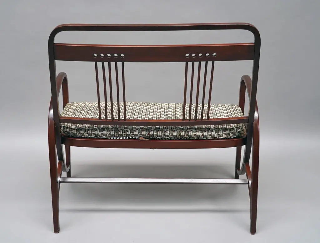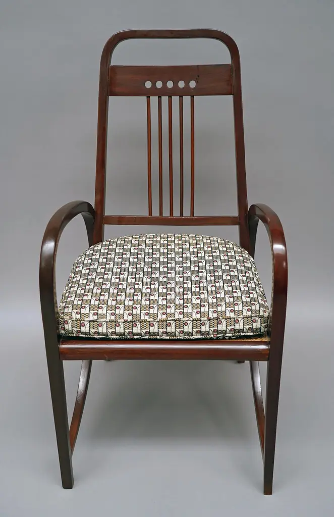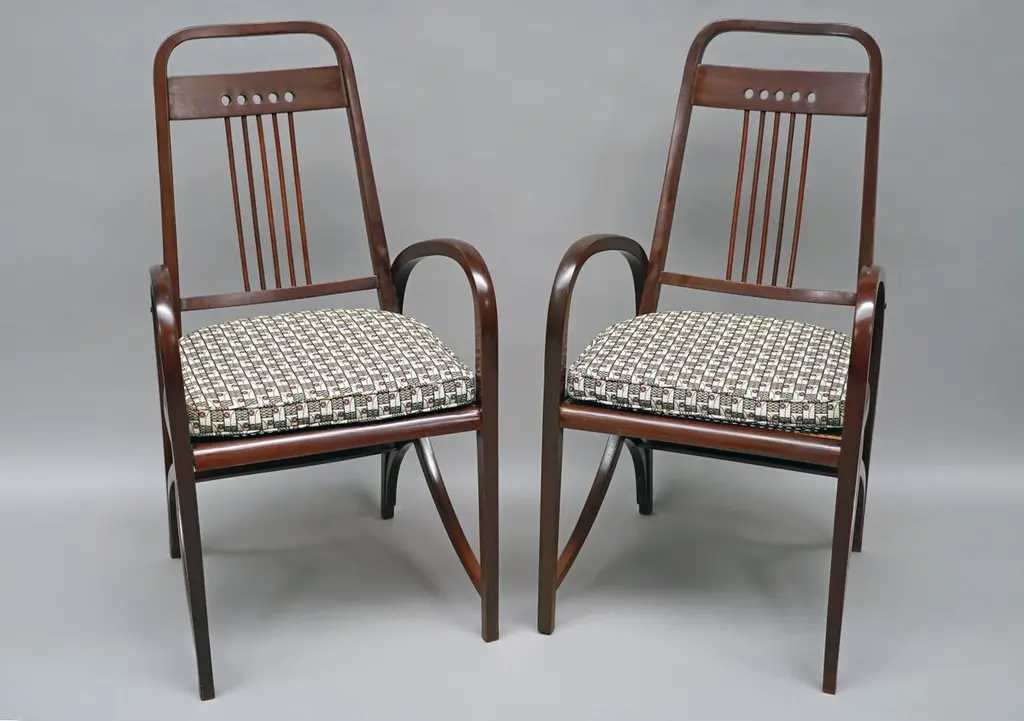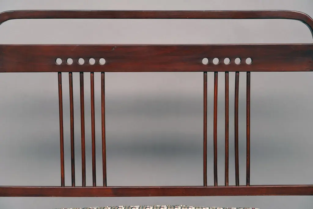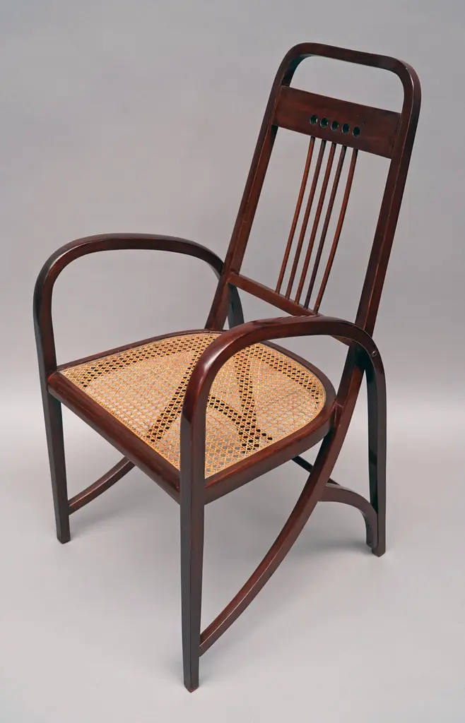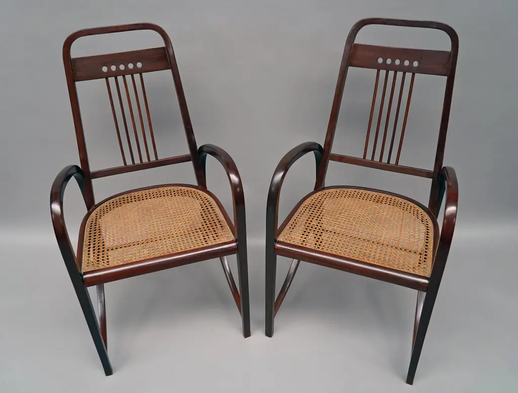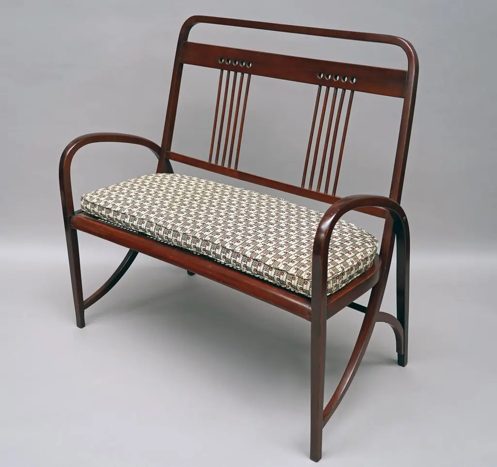 Stamped and bearing the label THONET WIENArmchairs – Height : 106 cm (41,7 in.) ; Width : 54,5 cm (21,5 in.) ; Depth : 55 cm (21,7 in.)Sofa – Height : 106 cm (41,7 in.) ; Length : 105,5 cm (41,5 in.) ; Depth : 53,5 cm (21 in.)Gueridon – Height : 74 cm (29,1 in.) ; Diameter : 65,5 cm (25,8 in.)Jette-habits – Height : 137 cm (53,9 in.) ; Length : 130 cm (51,2 in.) ; Depth : 44 cm (17,3 in.)Elegant salon set in curved wood and cane, composed of two armchairs, a sofa, a gueridon and a jette-habits. The armchairs and the sofa have openwork backs decorated with five circular perforations and five vertical bars, and a geometric patterned cushion covers the seat.The jette-habits is made up of three upper crosspieces in the shape of a humpback, an intermediate cane shelf extended by umbrella stands at the ends, and finally, a base ending in metal trays used to collect water from umbrellas or rain clothes.They are accompanied by a gueridon designed by Josef Hoffmann and Gustav Siegel, with a circular top and base connected by four uprights formed of double columns separated by a sphere.Related work :The armchairs and the sofa are derived from the 511 model produced by Thonet from 1904, the bench under the number 2511, and the armchair under the number 1511. The jette-habits is listed under the number 11951Biography :Michael Thonet (1796-1871) was a German-Austrian cabinetmaker and industrialist spotted, brought by Prince Clemens Metternich, Chancellor of Austria to Vienna in 1842, where he presented his creations to the Emperor. Employed by Clemens List, the leading Viennese cabinetmaker, the latter recommended him to the English architect of the Prince of Liechtenstein, and he was entrusted with the creation of the furniture and parquet flooring for the Liechtenstein Palace. In July 1851, Thonet presented his latest furniture at the London Universal Exhibition, where he received the Bronze Medal, contributing to his international reputation. Faced with the influx of orders, he expanded his facilities and purchased his first steam engine. Around forty employees worked in the company when he handed it over to his five sons, including a chemist ; but he actually continued to run it until his death.International exhibitions expanded markets, and Thonet increased production. He moved the factory to Koryčany, Moravia, in July 1856, employing 300 workers and producing 200 pieces of furniture per day. In 1859, he decided to create a new company, and there he developed chair No. 14, which he created for Anna Daum, director of the Daum café, who dreamed of “practical, elegant and space-saving chairs.” Orders quickly followed, and Thonet decided to mass-produce No. 14 ; it would become his first industrial model, even bearing his name.By the time of his death in 1871, his company had six factories in Europe, supplying a commercial network of 14 stores worldwide, including 15 Boulevard Poissonnière in Paris, which would become the headquarters of Thonet Frères France. Other shops were also located in Chicago and New York at this time. After 1945, Gebrüder Thonet was headquartered in Frankenberg, Germany. In 1976, the Austrian branch became independent under the name Thonet Wien. In 2006, the German company became Thonet GmbH.