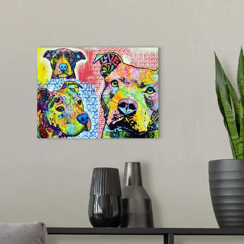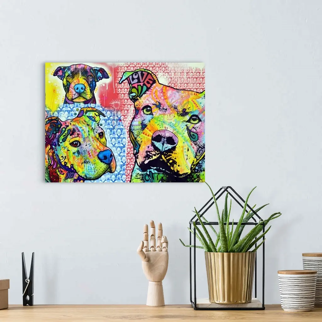 Abstractly painted canvas of three pit bulls with various patterns overlaid on top of them.