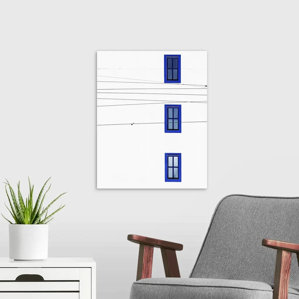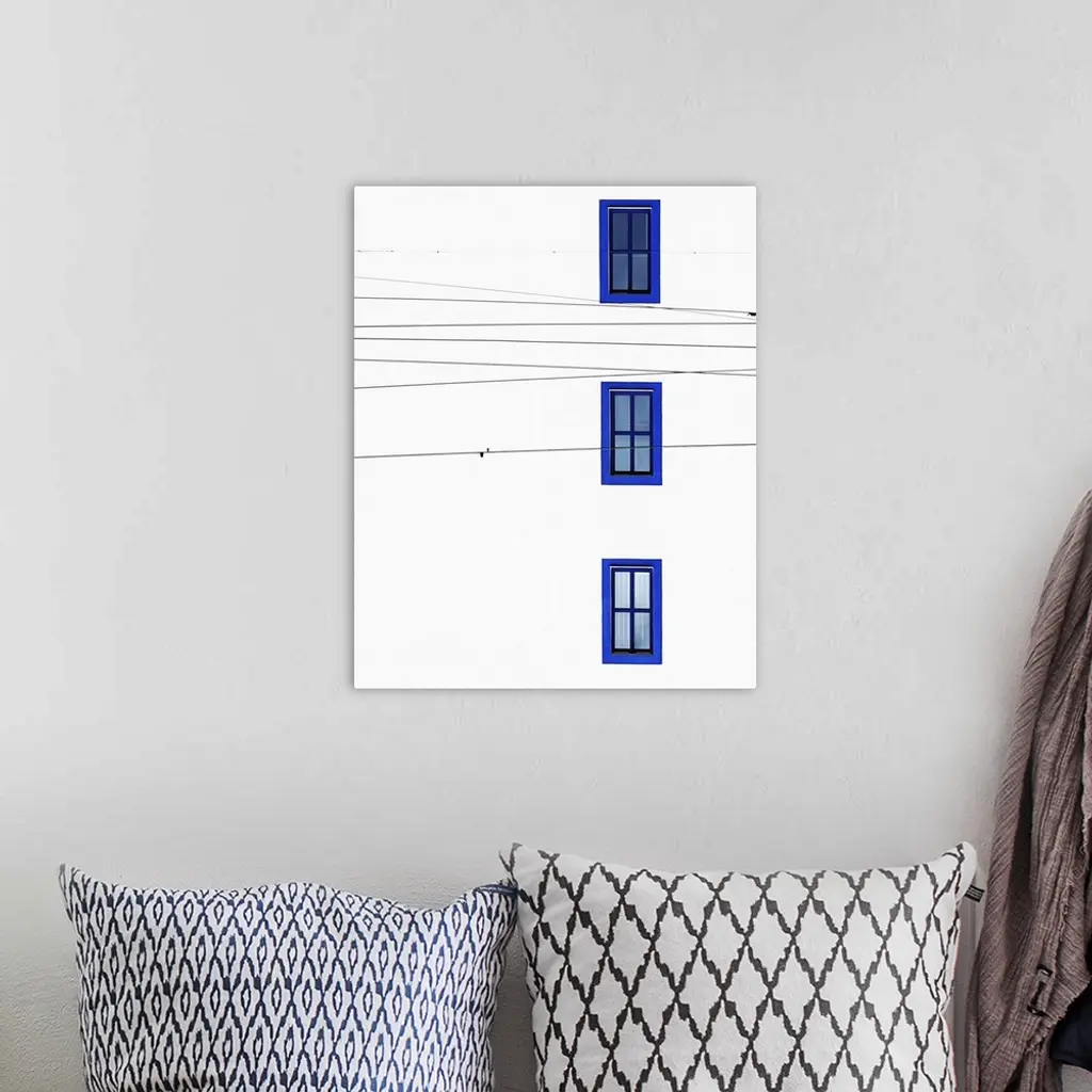 The wall of a building with three windows with blue frames and intersecting power lines.