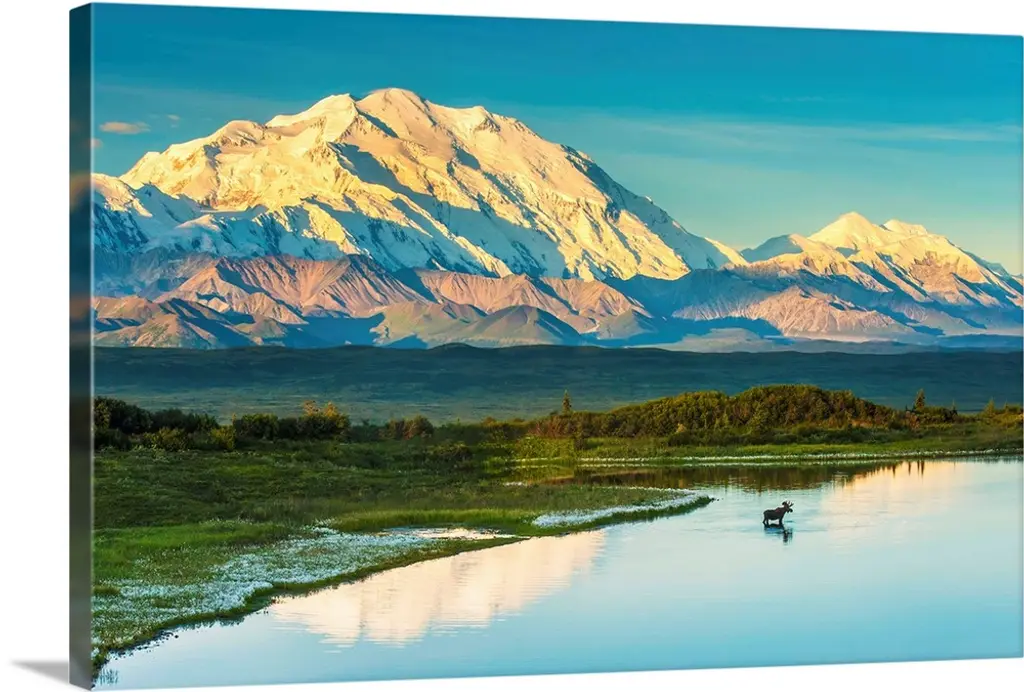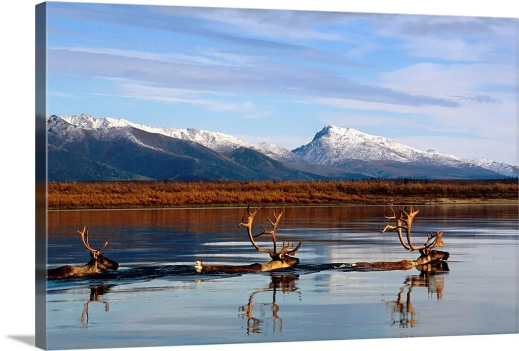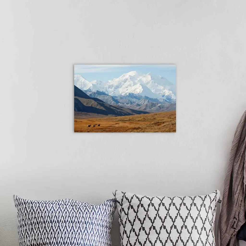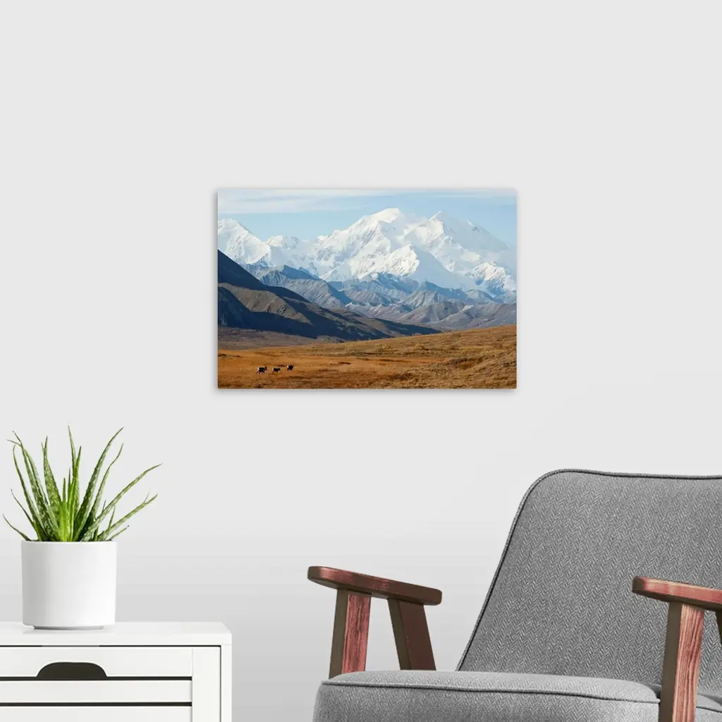 Three Caribou Run Thru The Tundra With Mt. Mckinley In Background, Interior Alaska wall art for home and office decor. Discover canvas art prints, photos, mural, big canvas art and framed wall art in GreatBigCanvas.com's varied collections.
