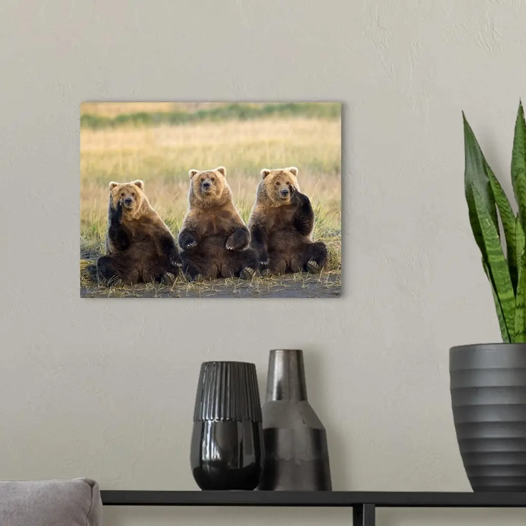 Three Grizzlies Sitting In Meadow Scratching Faces Katmai National Park Alaska