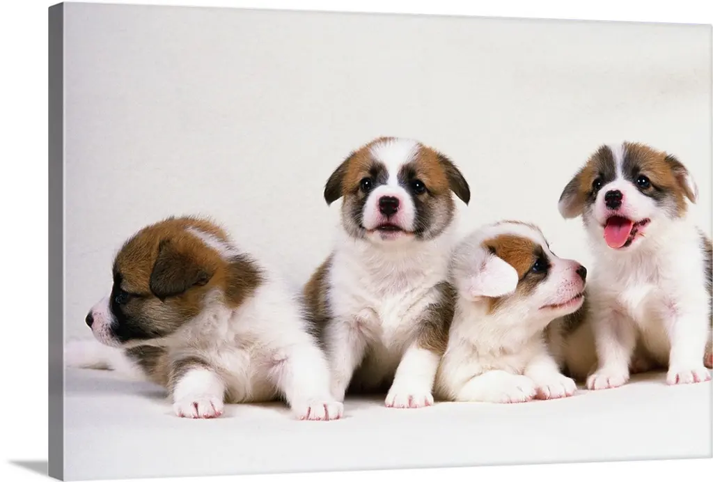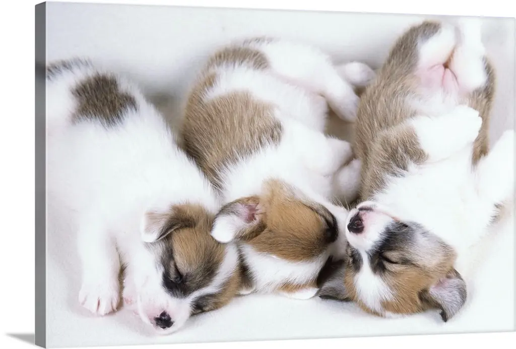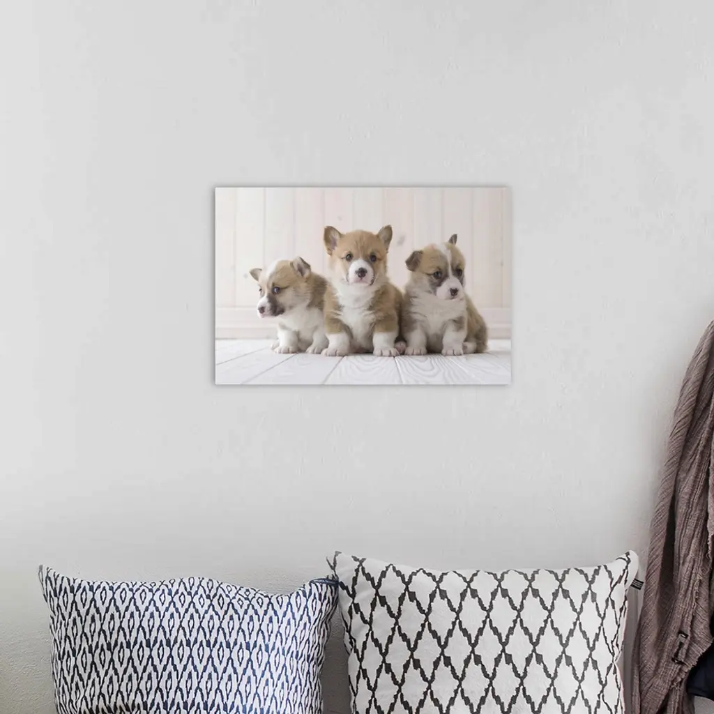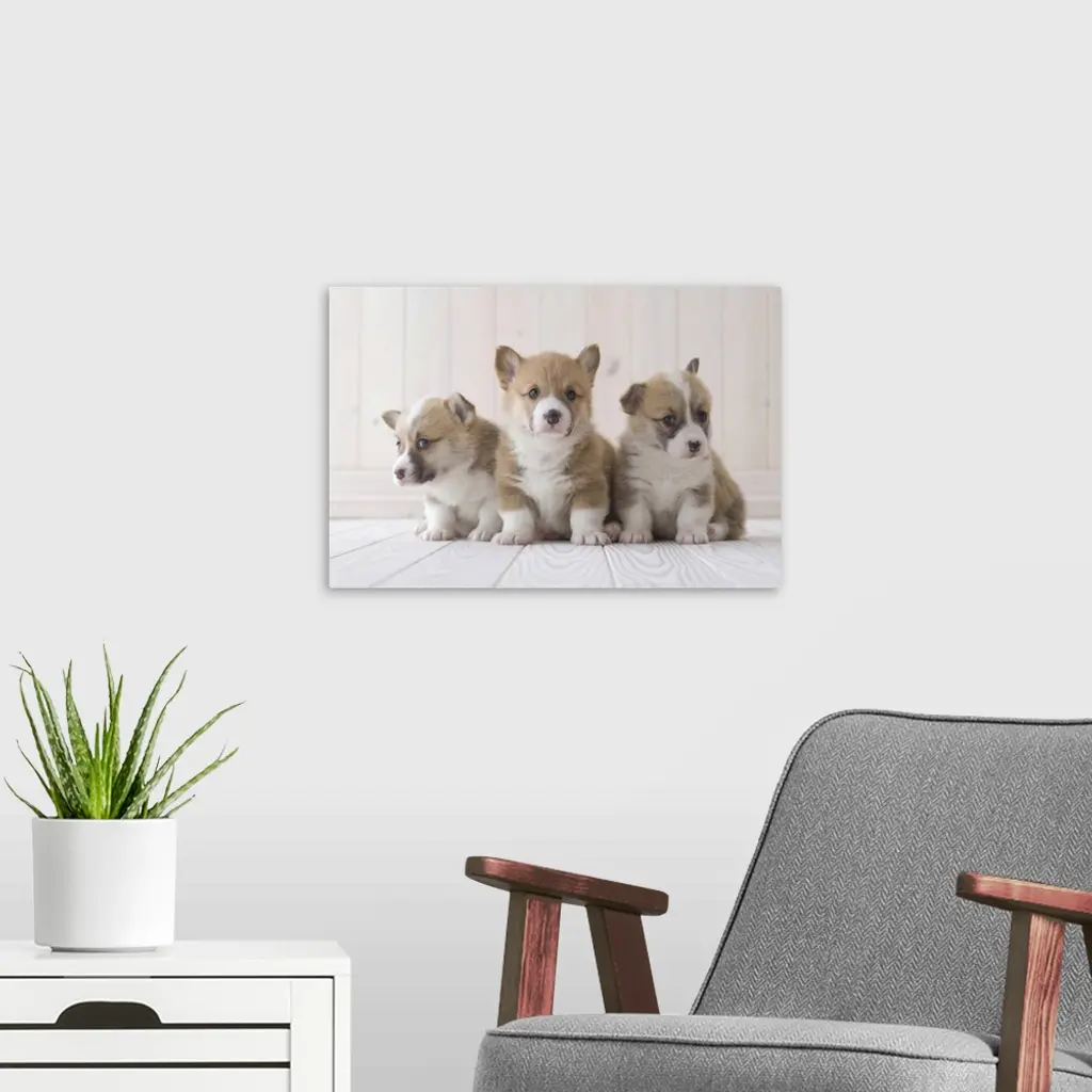 Three pembroke welsh corgi sitting on floor wall art for home and office decor. Discover canvas art prints, photos, mural, big canvas art and framed wall art in GreatBigCanvas.com's varied collections.