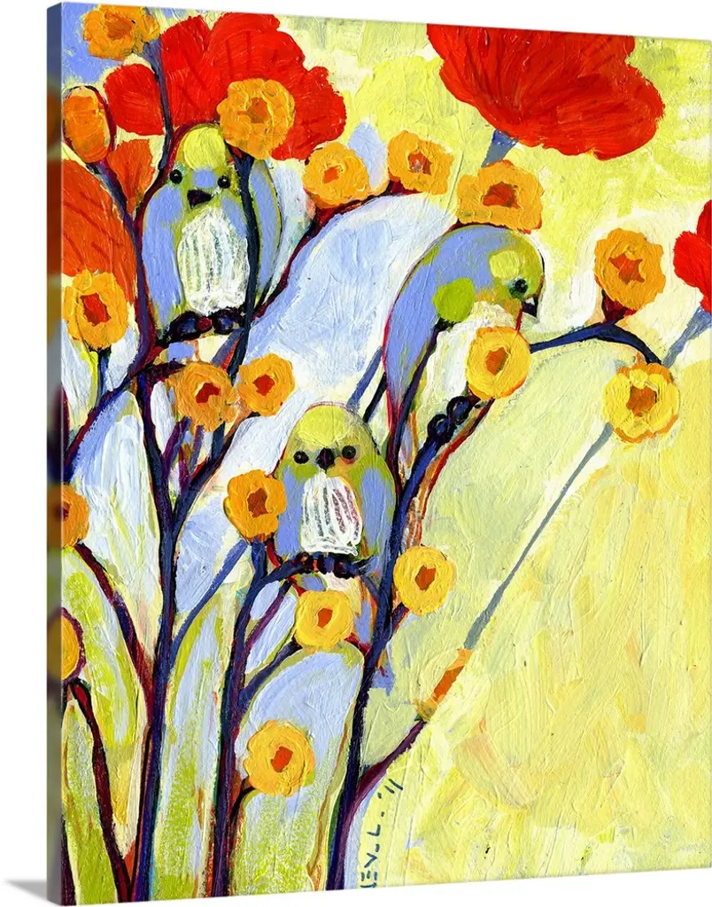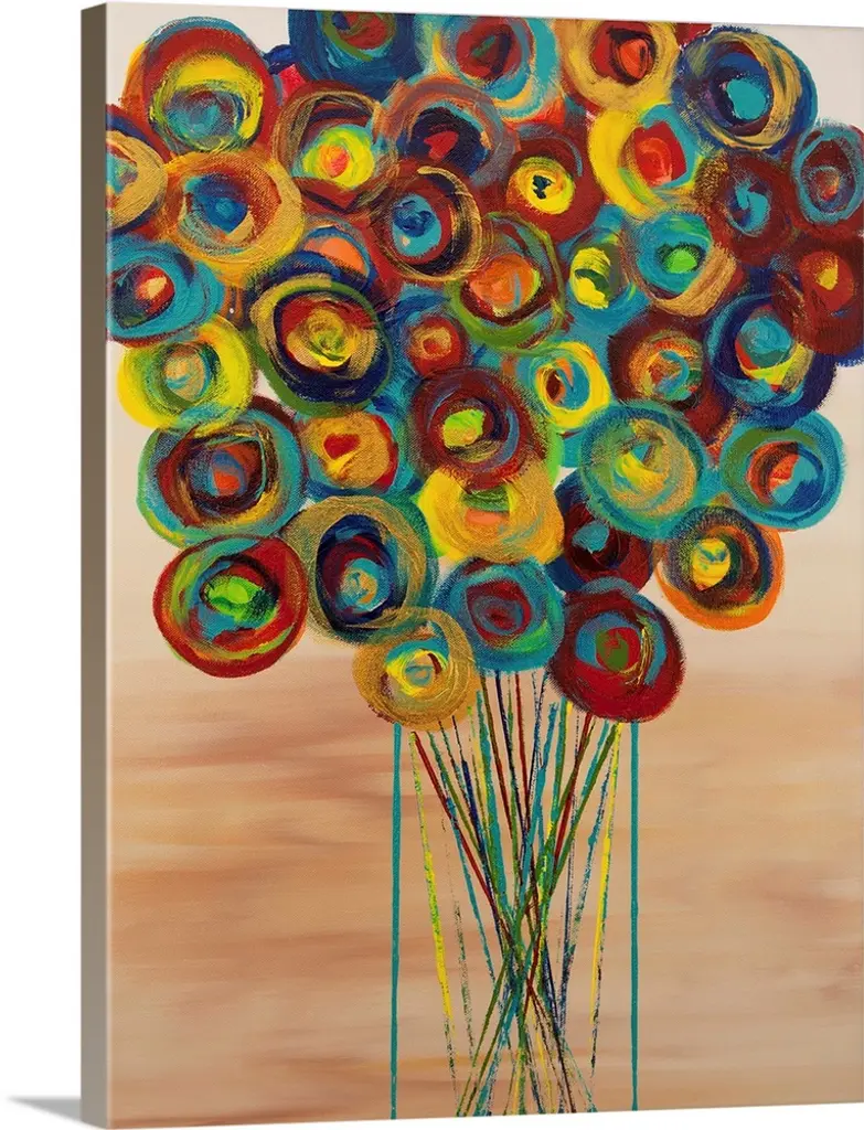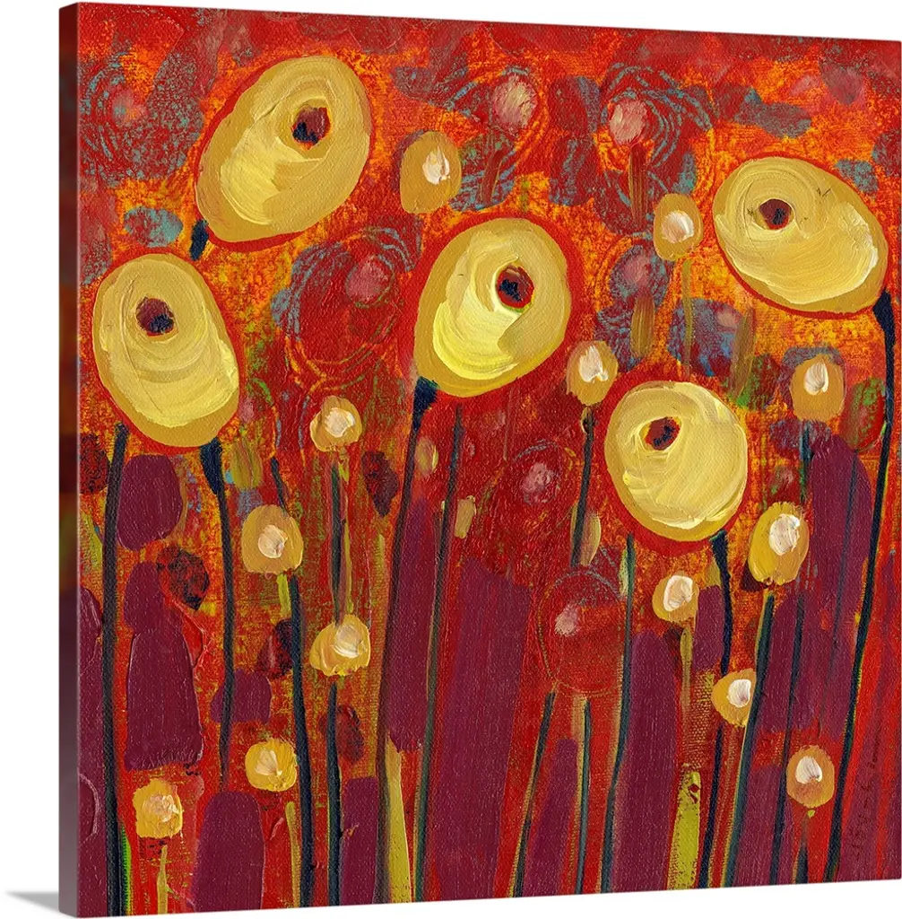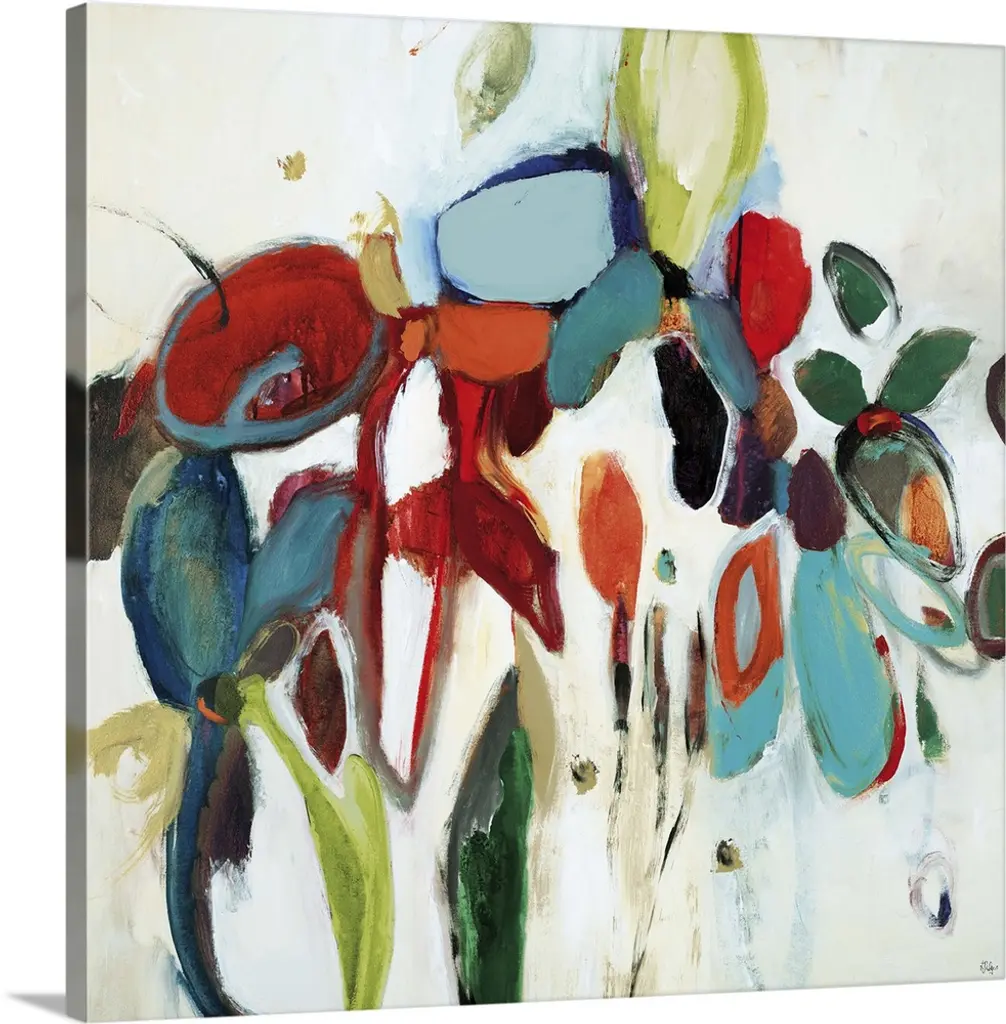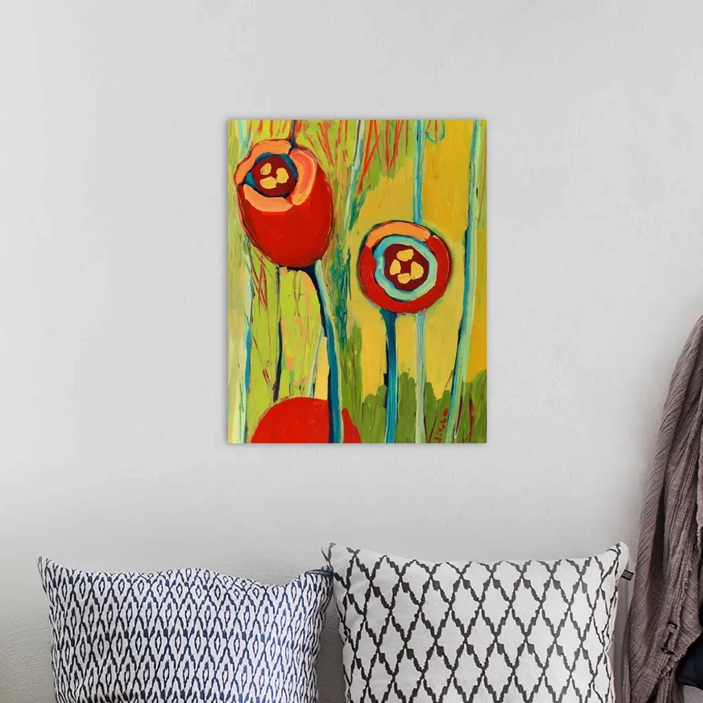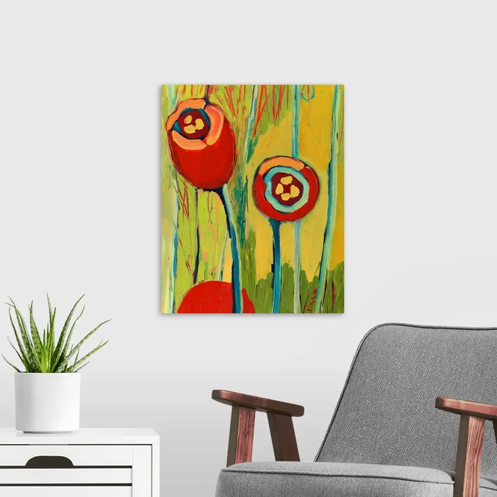 Big contemporary art focuses on a few brightly colored flowers sitting against a background of almost evenly spaced thin vertical lines and rectangles.
