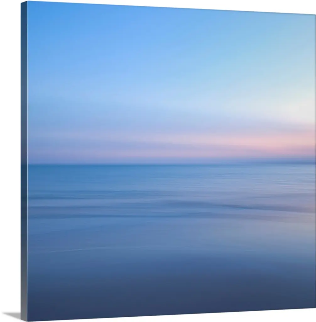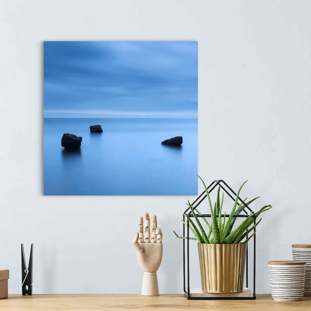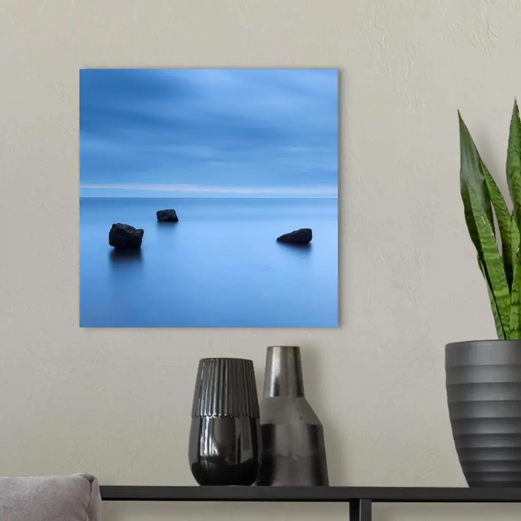 A zen calm minimal minimalist cool deep blue image of three rocks in a flat calm sea.