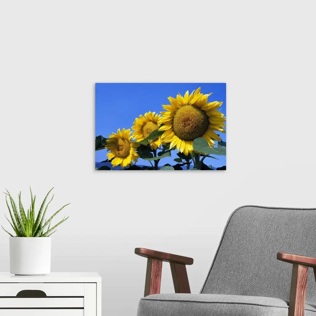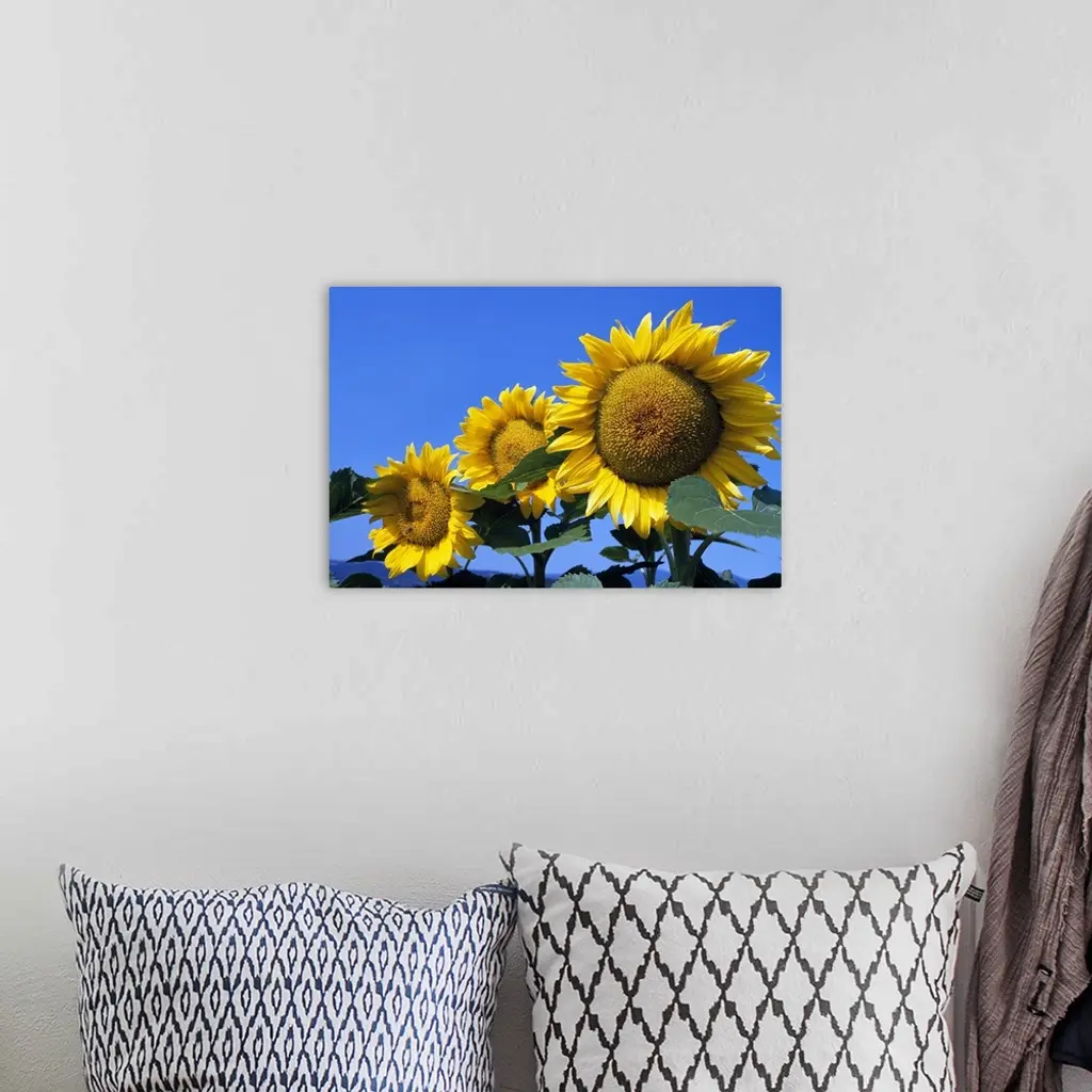 Three Sunflower Blossoms In A Row, Pale Blue Sky.