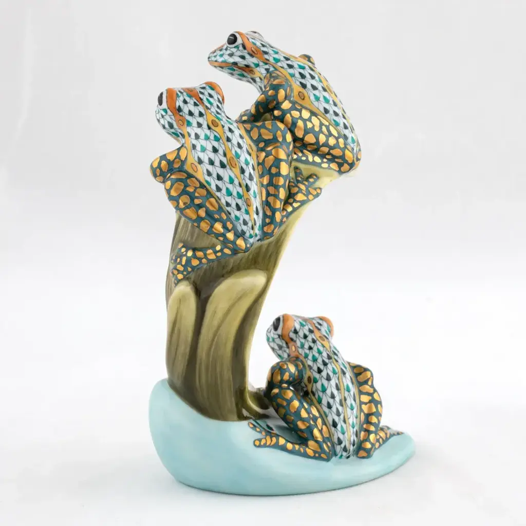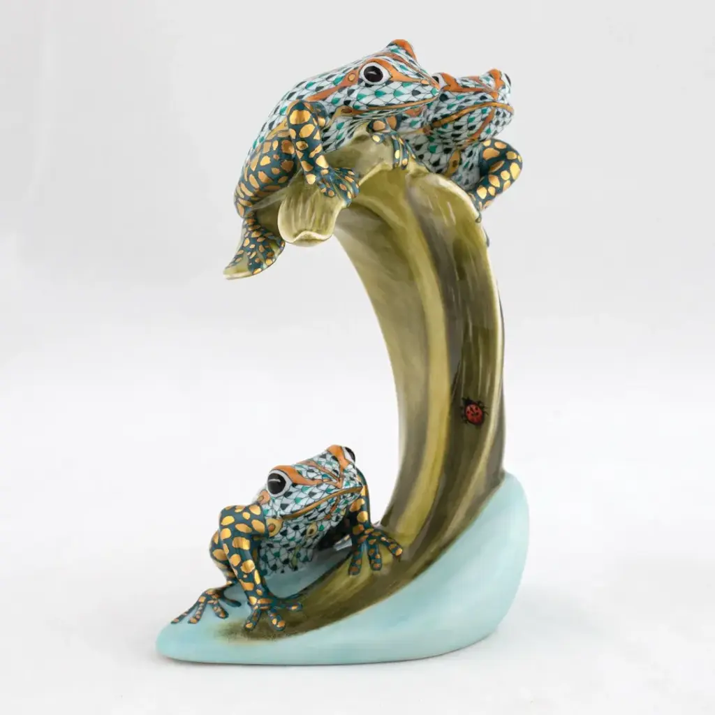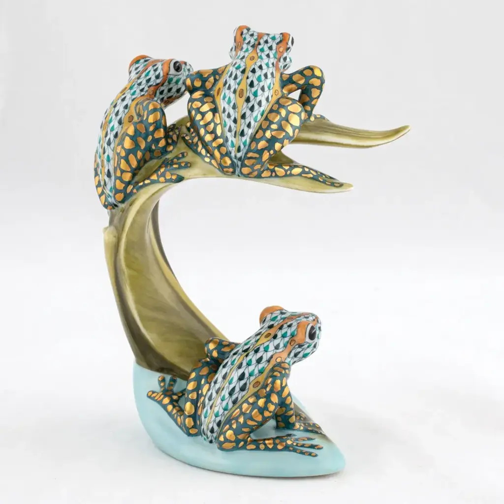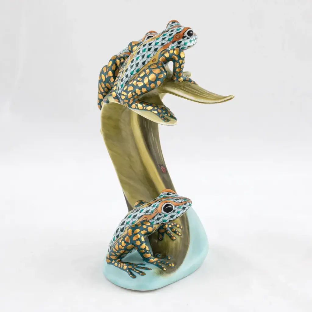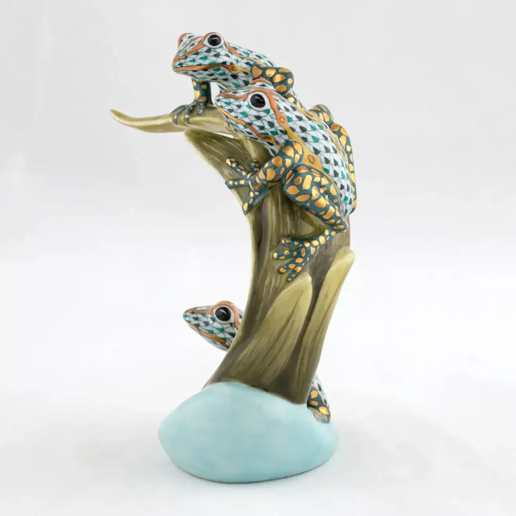 Limited Edition Size = 150 One can almost feel the humidity of the lush, wet forest these tree frogs call home. Covered in golden dew drops, this trio may have a serious countenance, but their vocalizations would clearly herald their joy at the beauty of their Herend-style flourishes. Now the biggest porcelain manufactory in Europe, Herend was founded in 1826 to produce earthenware in the small Hungarian village for which it was named. At the time, Hungary was flooded with low-cost pottery, but in 1839, Mor Fischer became the Manufactory’s new owner and he decided to focus on producing dinnerware replacement pieces for Europe’s royal families to complement their valuable porcelain patterns from Germany and the Far East. As his client base grew, Fischer commissioned his artists to begin designing dinnerware patterns of their own. Queen Victoria’s 1851 purchase of a large set for Windsor Castle was a milestone, setting the stage for aristocrats throughout Europe to clamor for Herend in their estates. In the 1850s, Herend added meticulously-crafted figurines to its creations. Herend’s trademark fishnet pattern, which is widely recognized and prized as Herend’s signature design, started in 1858 when an artist who was intrigued with a Chinese plate’s fish scale design painted it onto a rooster figurine to imitate feathers.