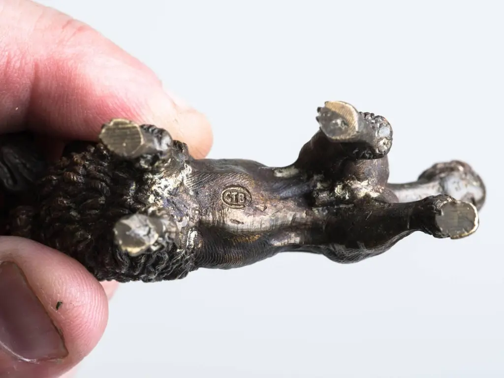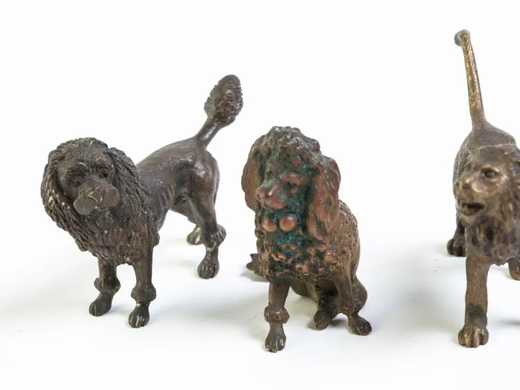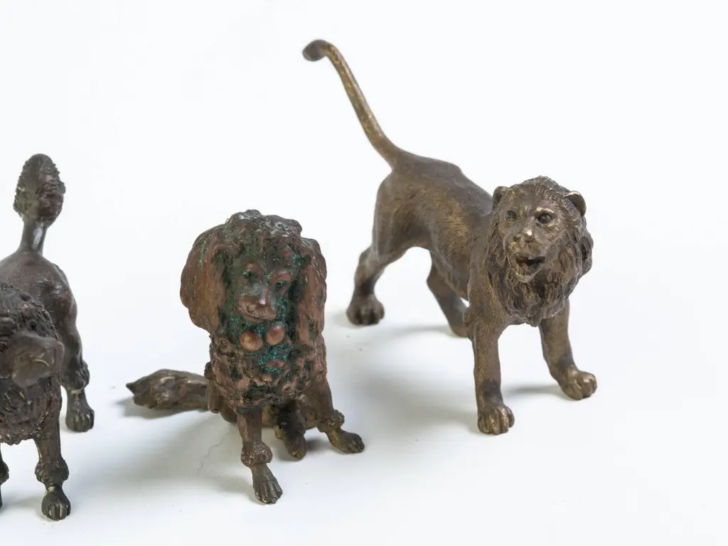 Three Vienna bronzesMeasurements are Dog W3 D1 H2.25 Poodle (sitting) W1.5 D 2 H2.25 Lion W3.35 D1 H2.25.