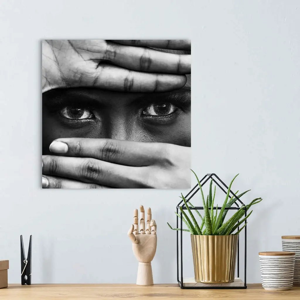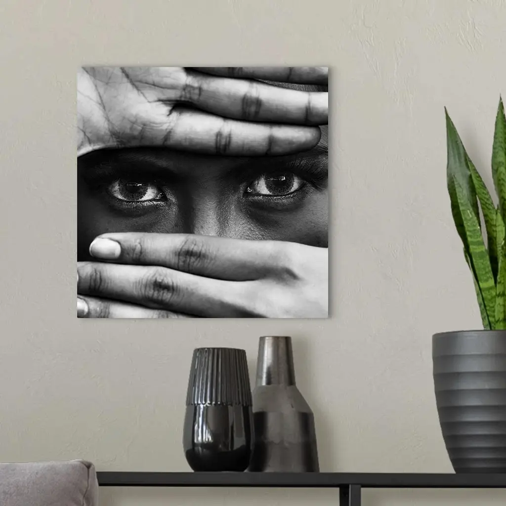 A black and white portrait of a close-up of hands covering a persons leaving the eyes exposed.
