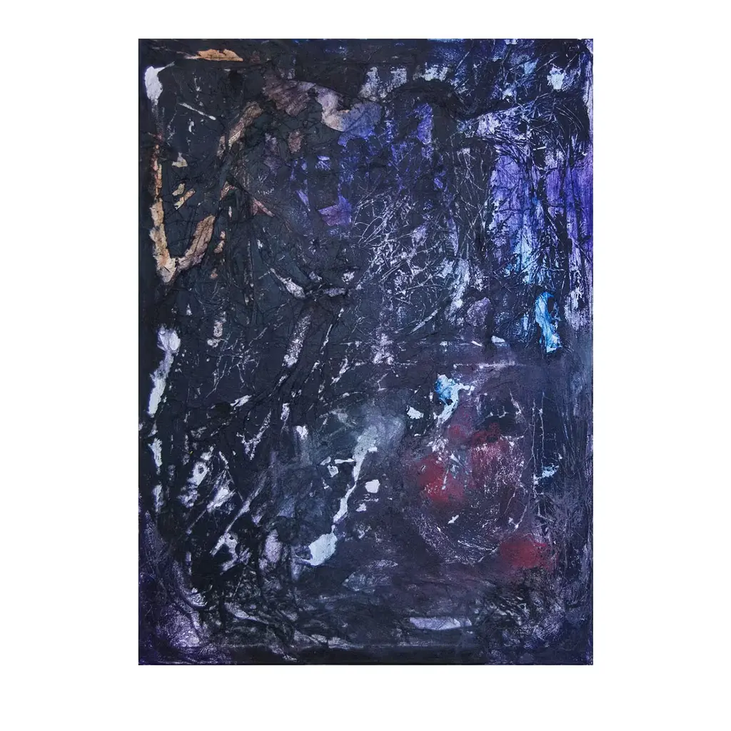 This custom piece from the Through The Moon series features an intricate and moody abstract design. It has a stunning display of visual impact that features a dark black background harmonizing with reds and blues and lighter pinks and yellows. This breathtaking work of art by Beata Pankiewicz is a study in duality that shifts between manmade and natural worlds as raw texture contrasts with intricate whimsy and organic imperfections. The complexity and abstract nature of her art allows for layers of surprise and discovery that reflect her own creative process.