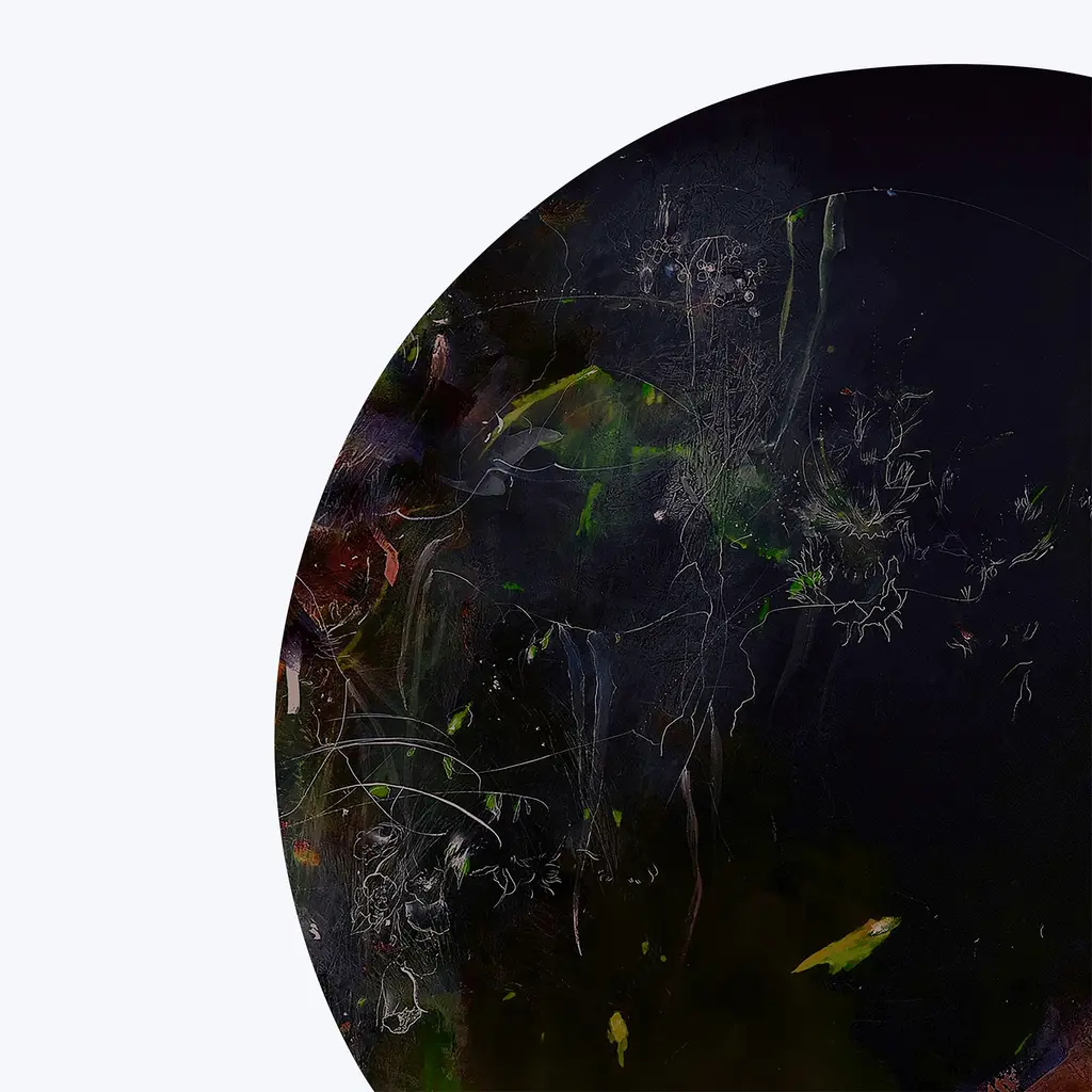 The intricate, abstract design in Through the moon XI is a stunning display of visual impact that features a dark black background in harmony with hints of green and red. This breathtaking work of art by Beata Pankiewicz is a study in duality that shifts between manmade and natural worlds as raw texture contrasts with intricate whimsy and organic imperfections. The complexity and abstract nature of her art allows for layers of surprise and discovery that reflect her own creative process.