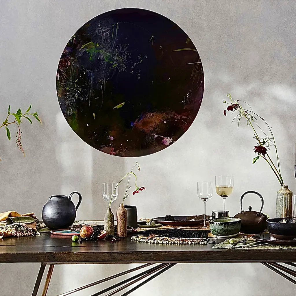 The intricate, abstract design in Through the moon XI is a stunning display of visual impact that features a dark black background in harmony with hints of green and red. This breathtaking work of art by Beata Pankiewicz is a study in duality that shifts between manmade and natural worlds as raw texture contrasts with intricate whimsy and organic imperfections. The complexity and abstract nature of her art allows for layers of surprise and discovery that reflect her own creative process.