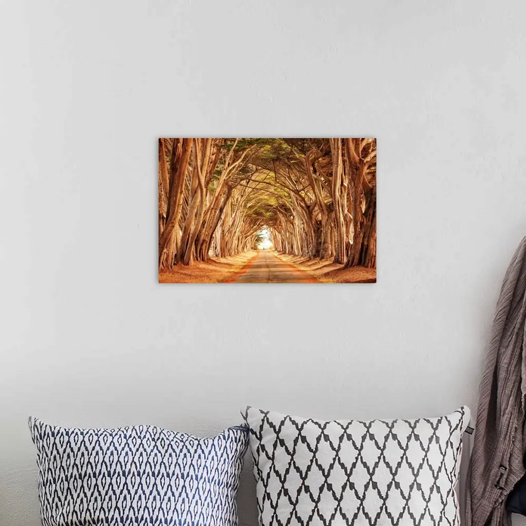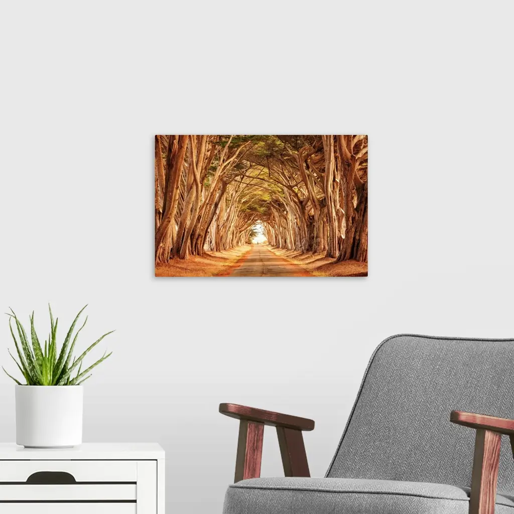 Road through a grove of golden-colored trees, California.