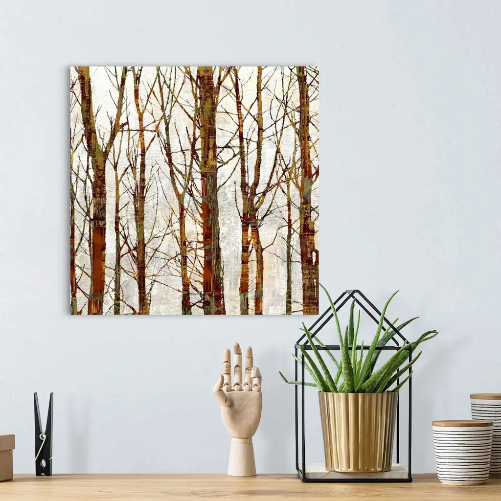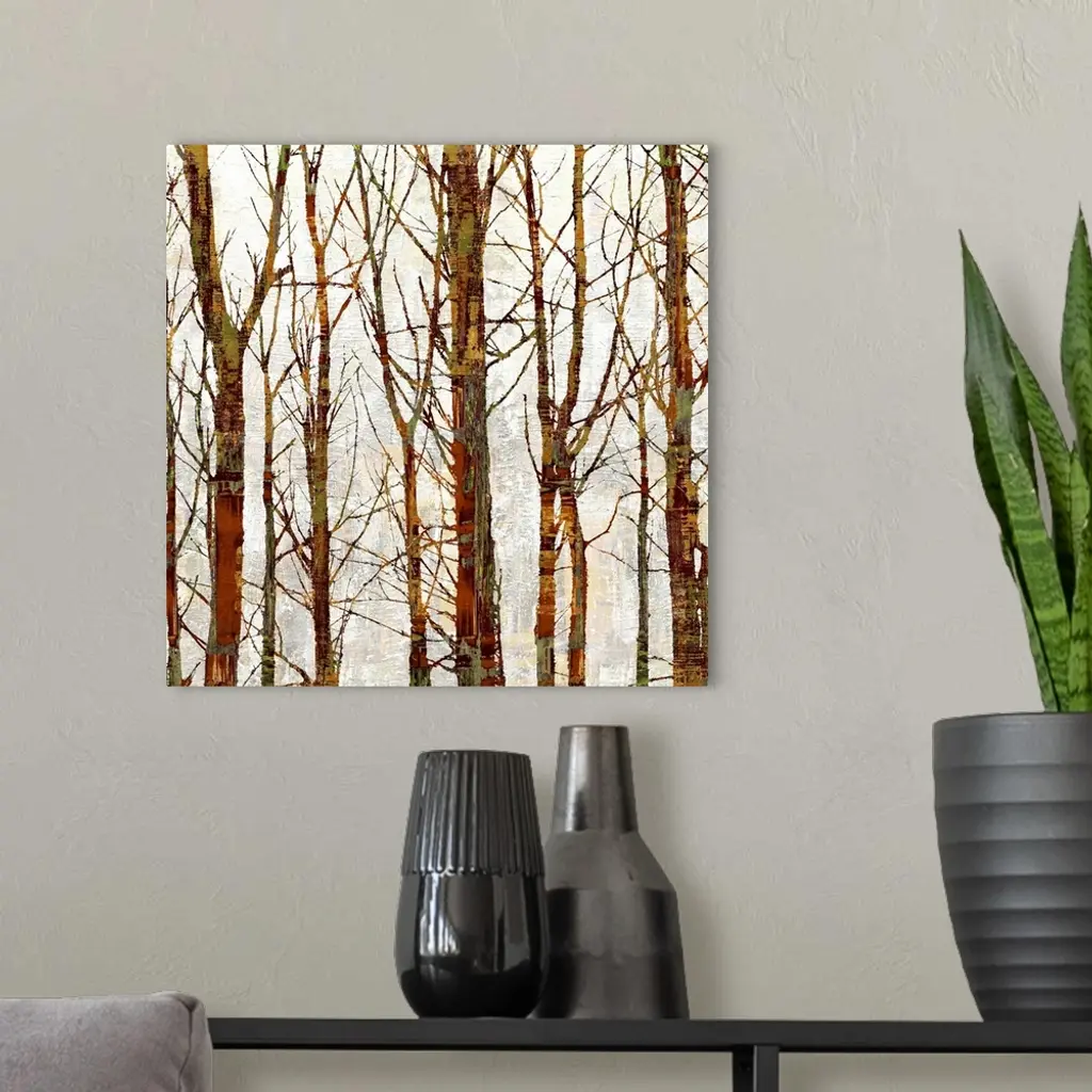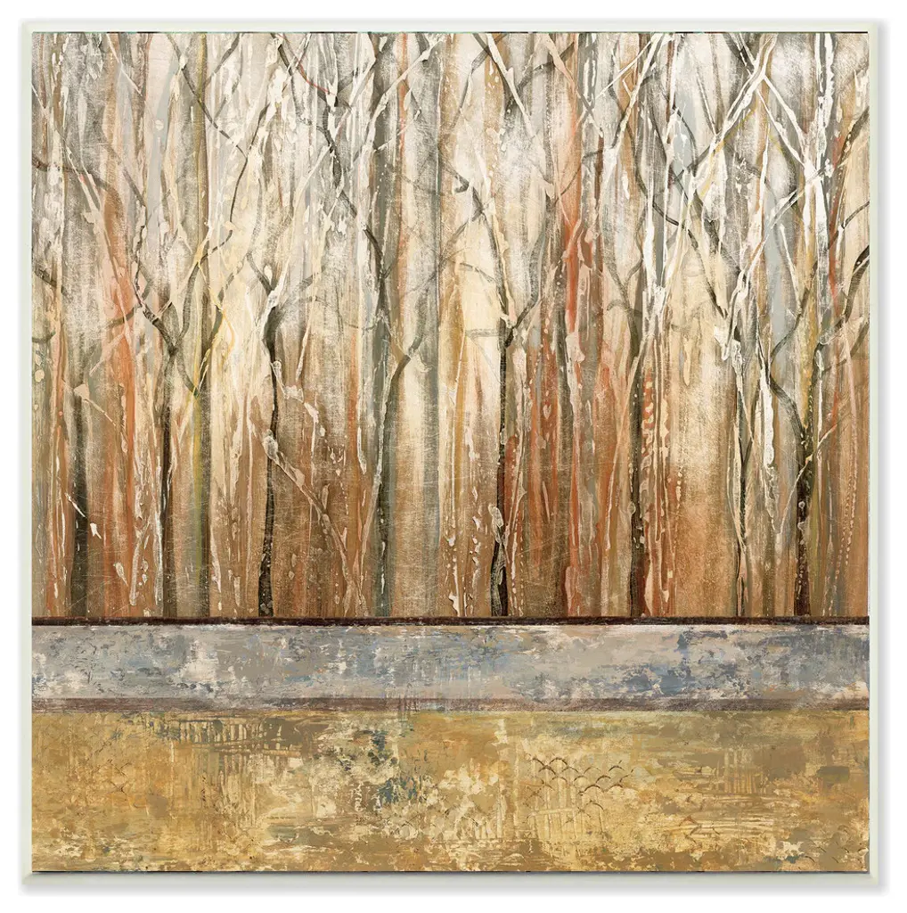 Square decor with large thin trees in shades of brown and green on a neutral colored background.