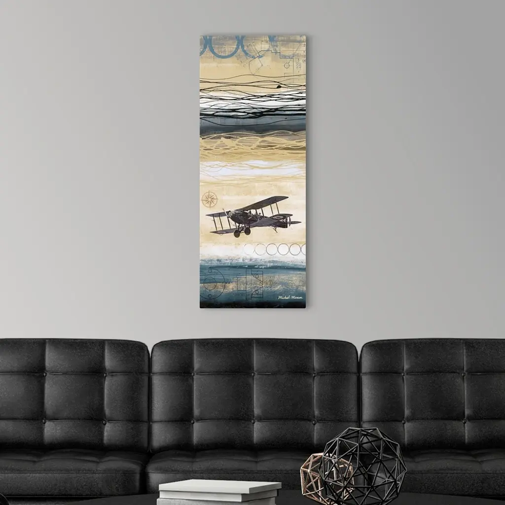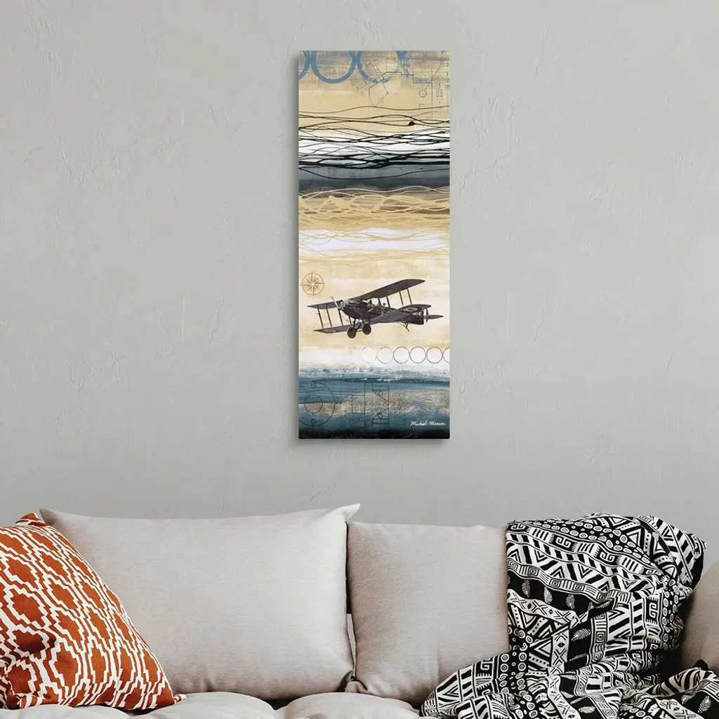 This vertical piece uses mostly cooler toned designs toward the top and very bottom of the print. In the middle of those designs is a classic airplane soaring through the sky.