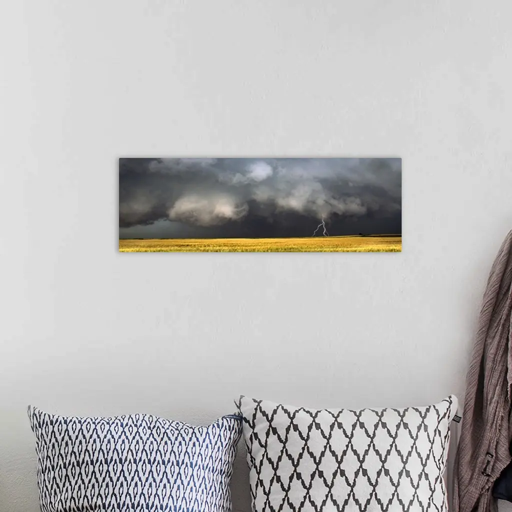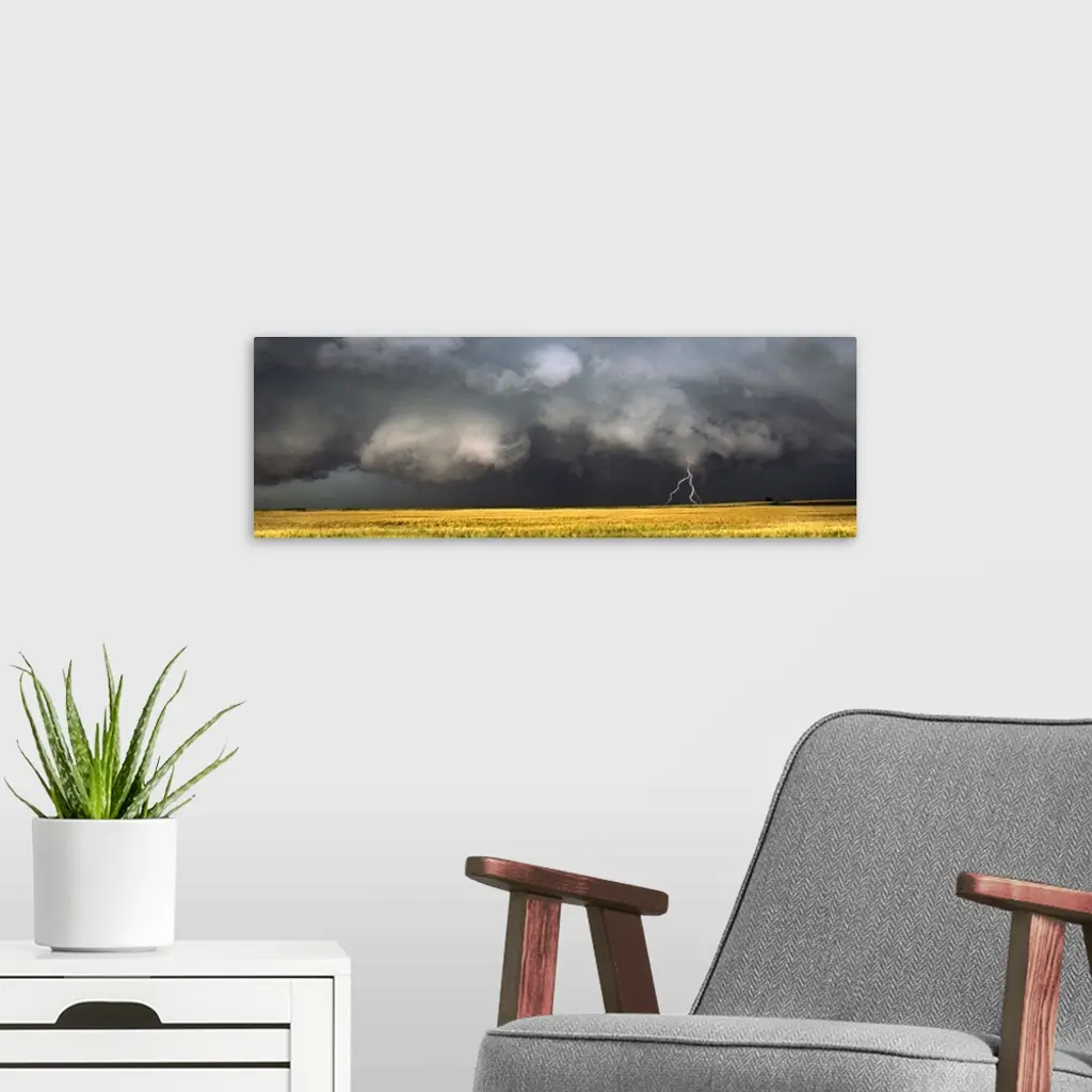 Panoramic photograph of storm clouds with lightning striking the ground over a meadow of tall grass.