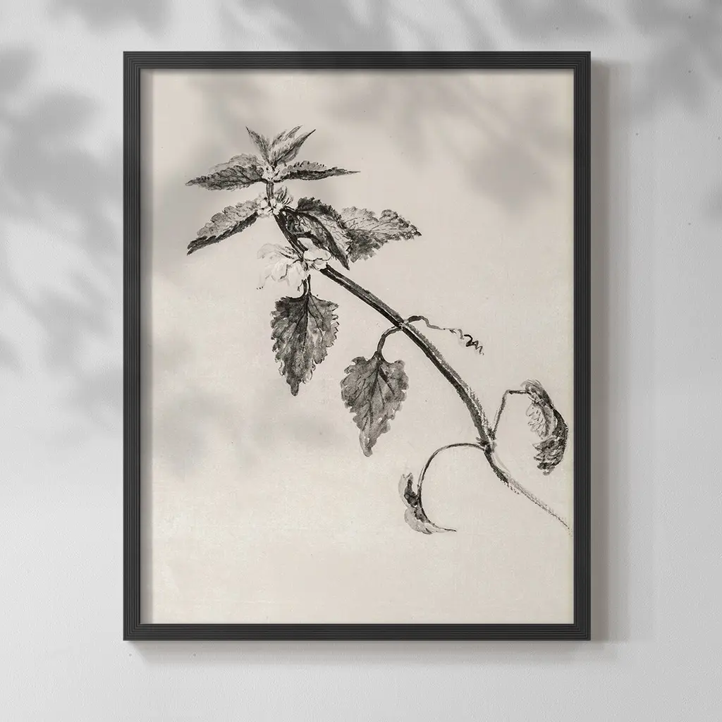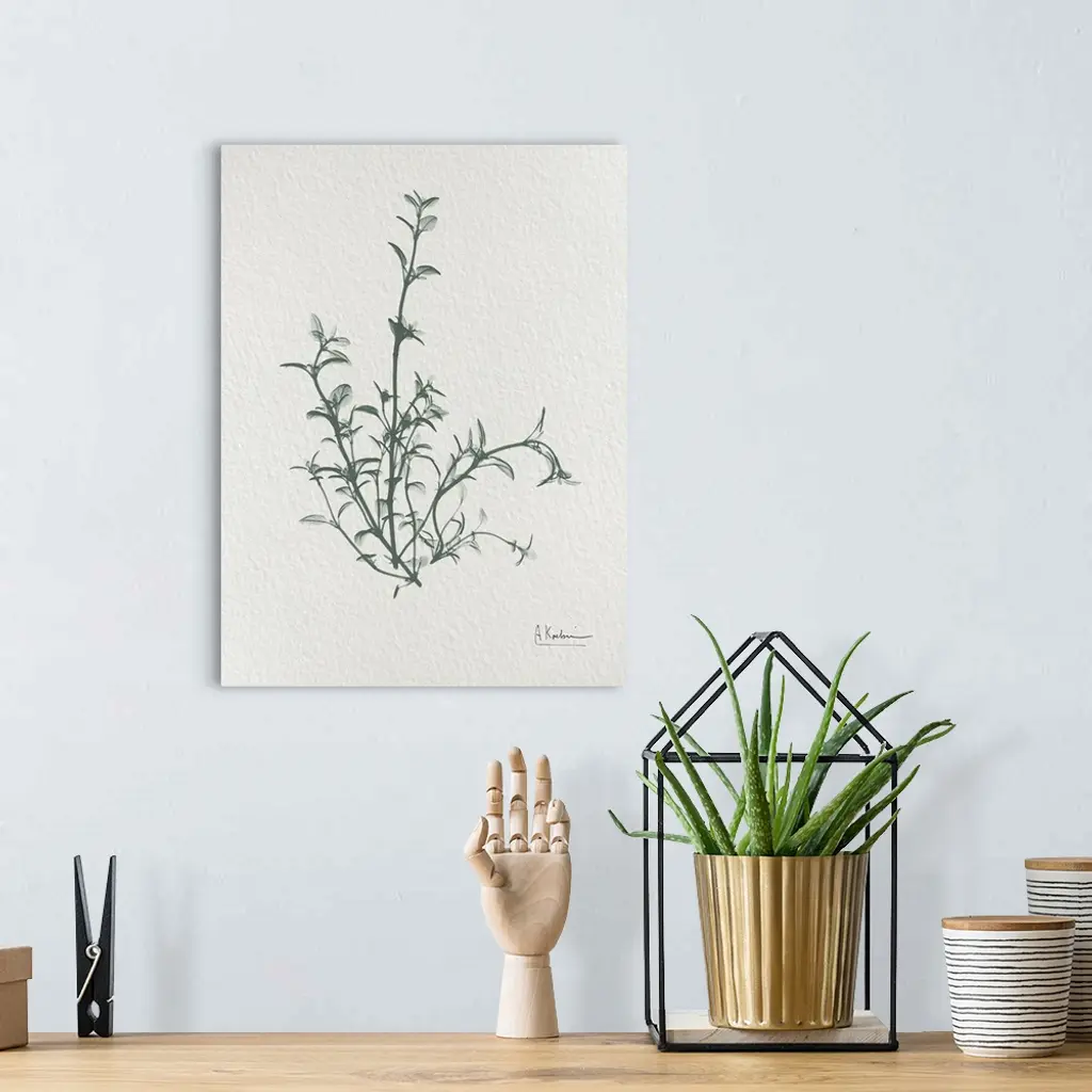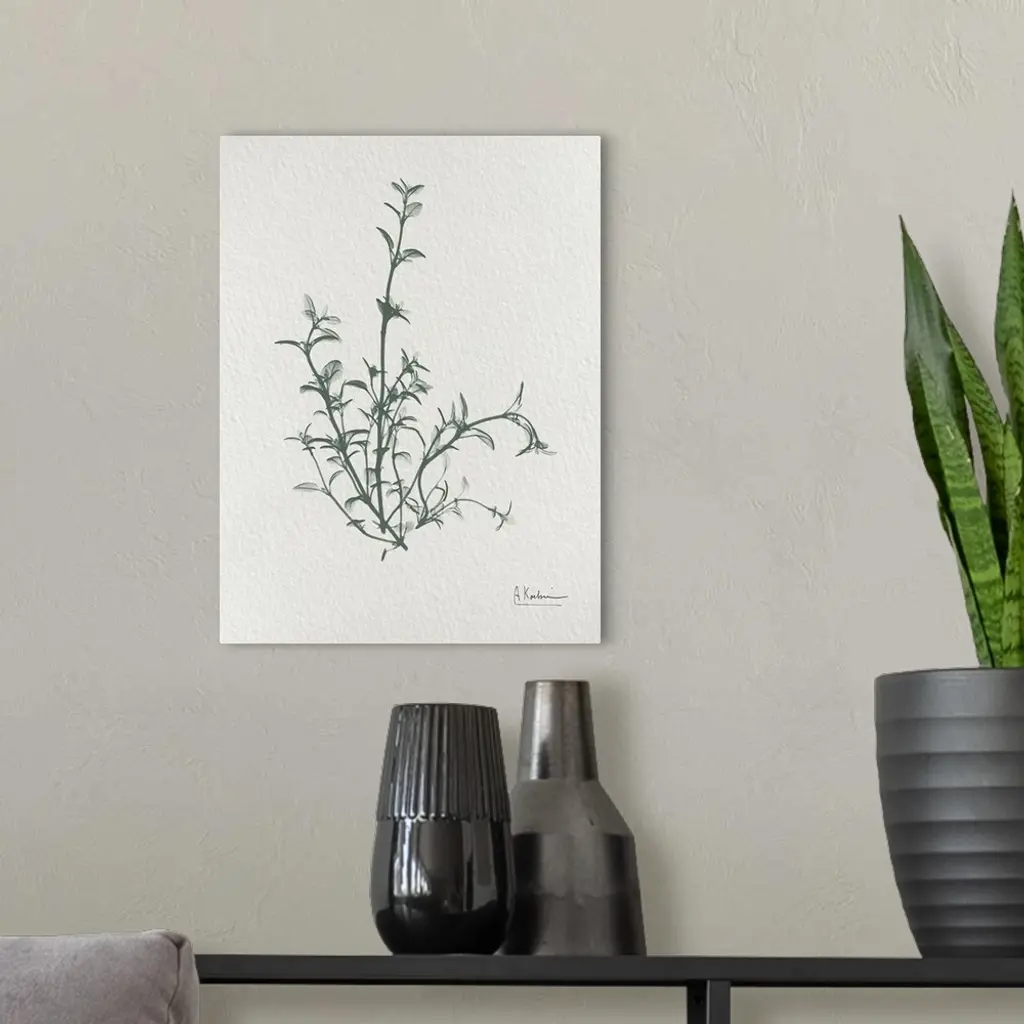 An x-ray photograph of sprigs of thyme on a watercolor paper background. A very simple image that would look great in a kitchen or country decor scheme