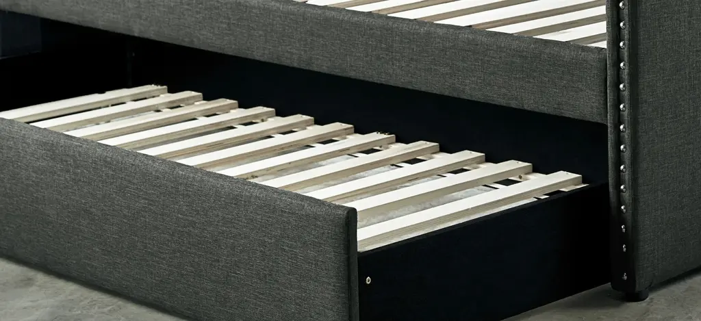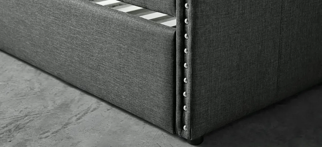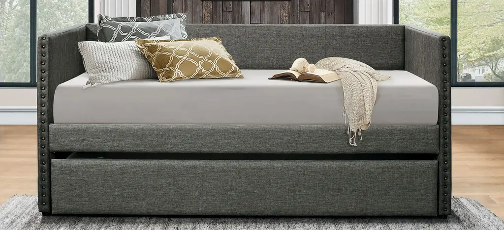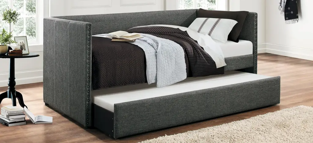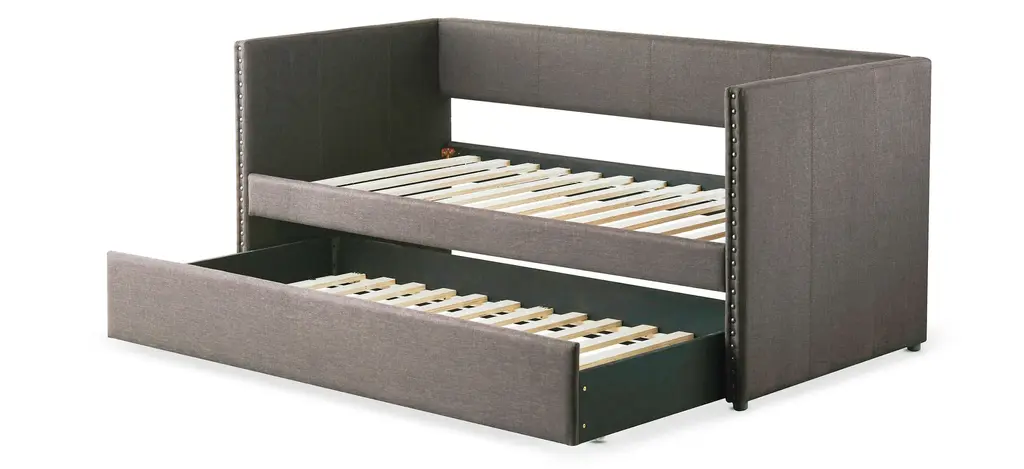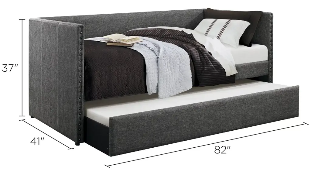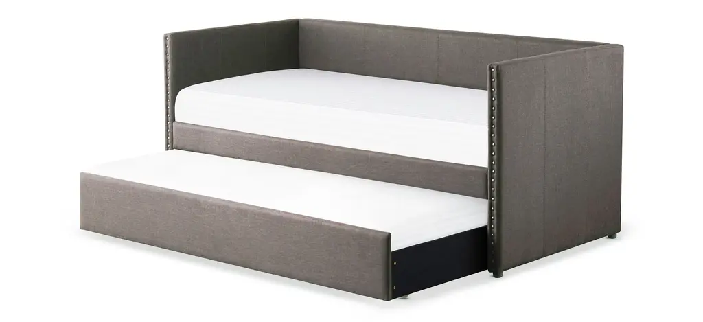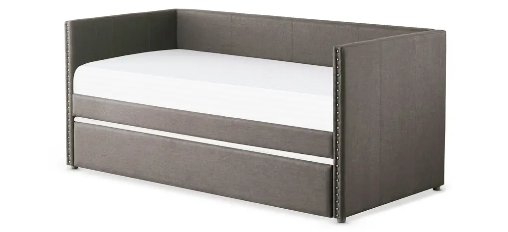 The fabric covering of the Tia twin daybed with trundle is blended with nailhead accents and clean lines, creating a look that compliments your home decor. Whether used for sleeping or relaxing, the clean-line daybed design allows for placement in a number of room sizes and configurations, while the under-bed trundle pulls out to accommodate your additional sleep space needs.