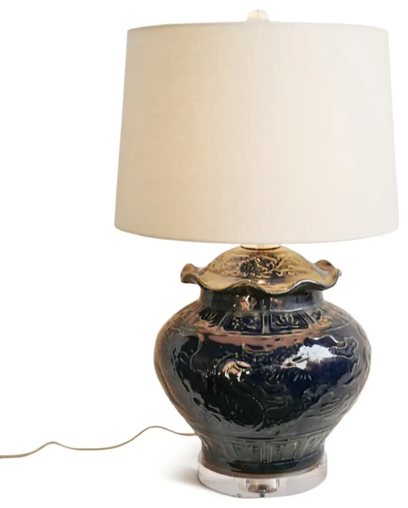 Infuse your space with bold character and cultural flair with the Tibetan Tiger Lamp. Featuring a sculpted ceramic body adorned with a striking tiger motif, this lamp celebrates traditional artistry with a modern twist. The warm, glazed finish pairs beautifully with antique brass accents and a soft white tapered shade, making it a captivating focal point for any room