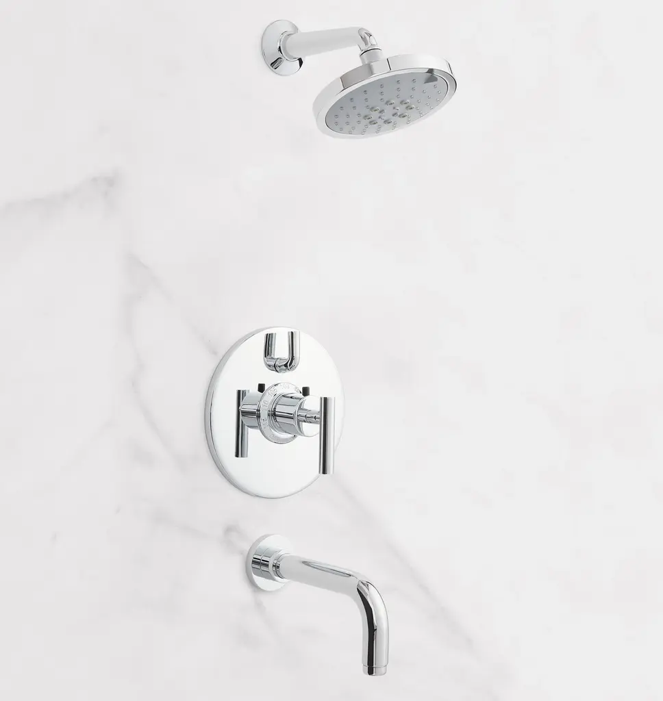 With clean curves and a modern design, our Tiburon Thermostatic Shower & Tub Set adds a soft minimalist look to your bathroom. Crafted from solid brass with dual knobs that make it easy to adjust water temperature and pressure separately, offering superior water flow, consistent temperature, and increased energy efficiency. This set has a flow rate of 1.8 gallons per minute and includes a 3-function shower head with rain, air, and massage settings. Available in several finish options.For our handcrafted plumbing selection, we partner with companies a lot like our own. Based in Huntington Beach, California Faucets has designed, assembled, and finished all its own parts since 1988. We worked closely with them on this collection to bring you the finest fittings available.