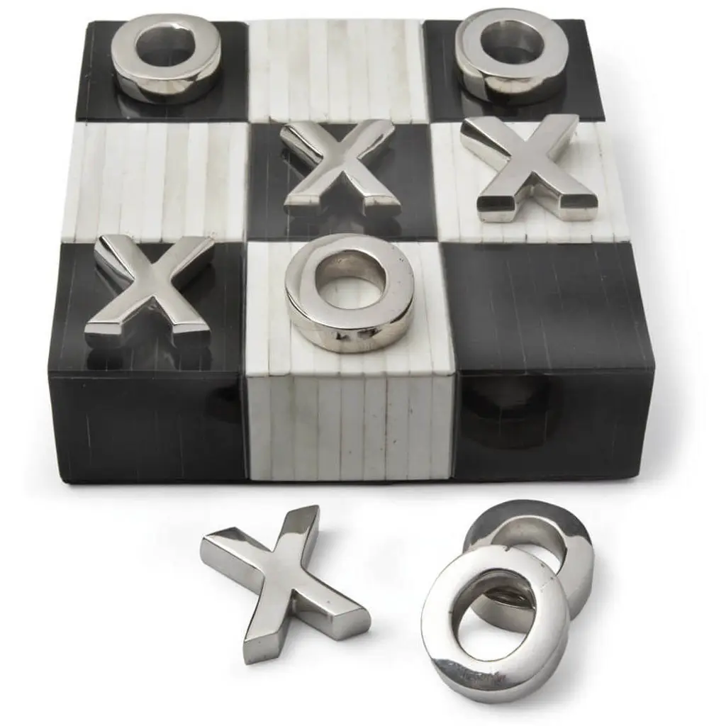 A classic game turned decor. This stylish and functional Tic Tac Toe game is played with brass X's and O's on a natural-finished, checkered pattern bone board.