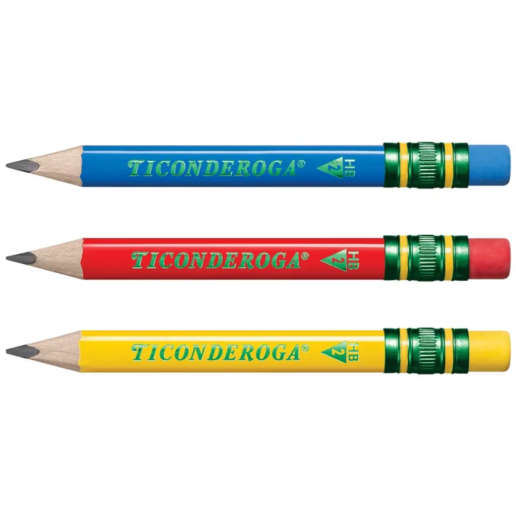 Ticonderoga® My First® Short Wooden Pencils, Large Triangle Barrel, Sharpened, #2 HB Soft, With Eraser, Primary Colors, 12 Count | These Ticonderoga® My First® short length (4.5") pencils deliver all the benefits of other My First® products with the added benefit of helping young children learn their primary colors. Short pencils provide better control and promote a more natural grip. recognized essential by experts in early learning handwriting. The large diameter (13/32") reduces writing fatigue and the triangular shape promotes the correct 3 finger grip. Premium wood harvested from responsibly managed sources provides smooth, even sharpening with minimal breakage. Teachers prefer Ticonderoga® brand for its dependability and craftmanship. All Ticonderoga® pencils are PMA certified so you can use them with confidence. Each pack includes 12 pencils.