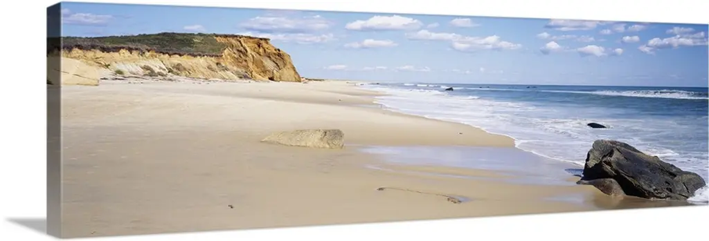This is a landscape panoramic photograph of a flat sandy shoreline and a calm sea with few clouds in the sky.