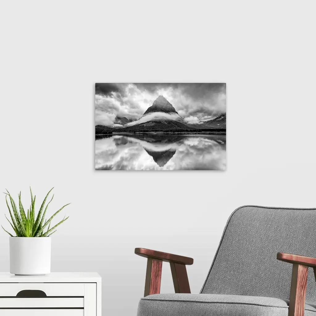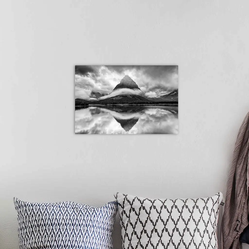 A black and white photograph of a pointed mountain surrounded by a ribbon of cloud while casting a perfect reflection in the water below.