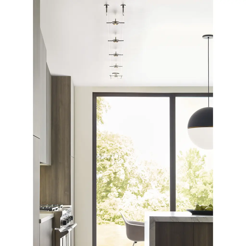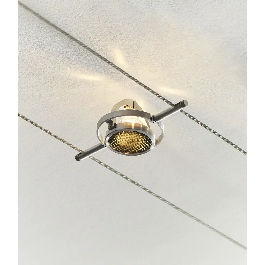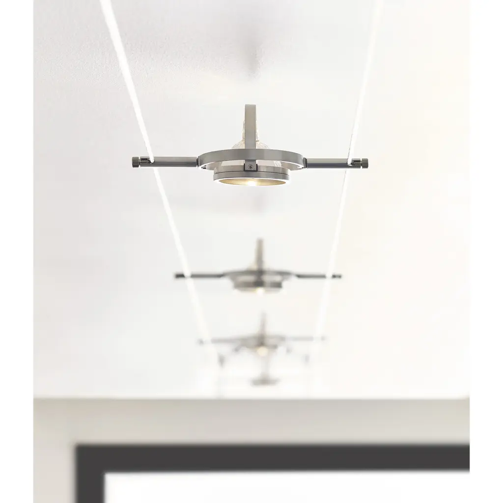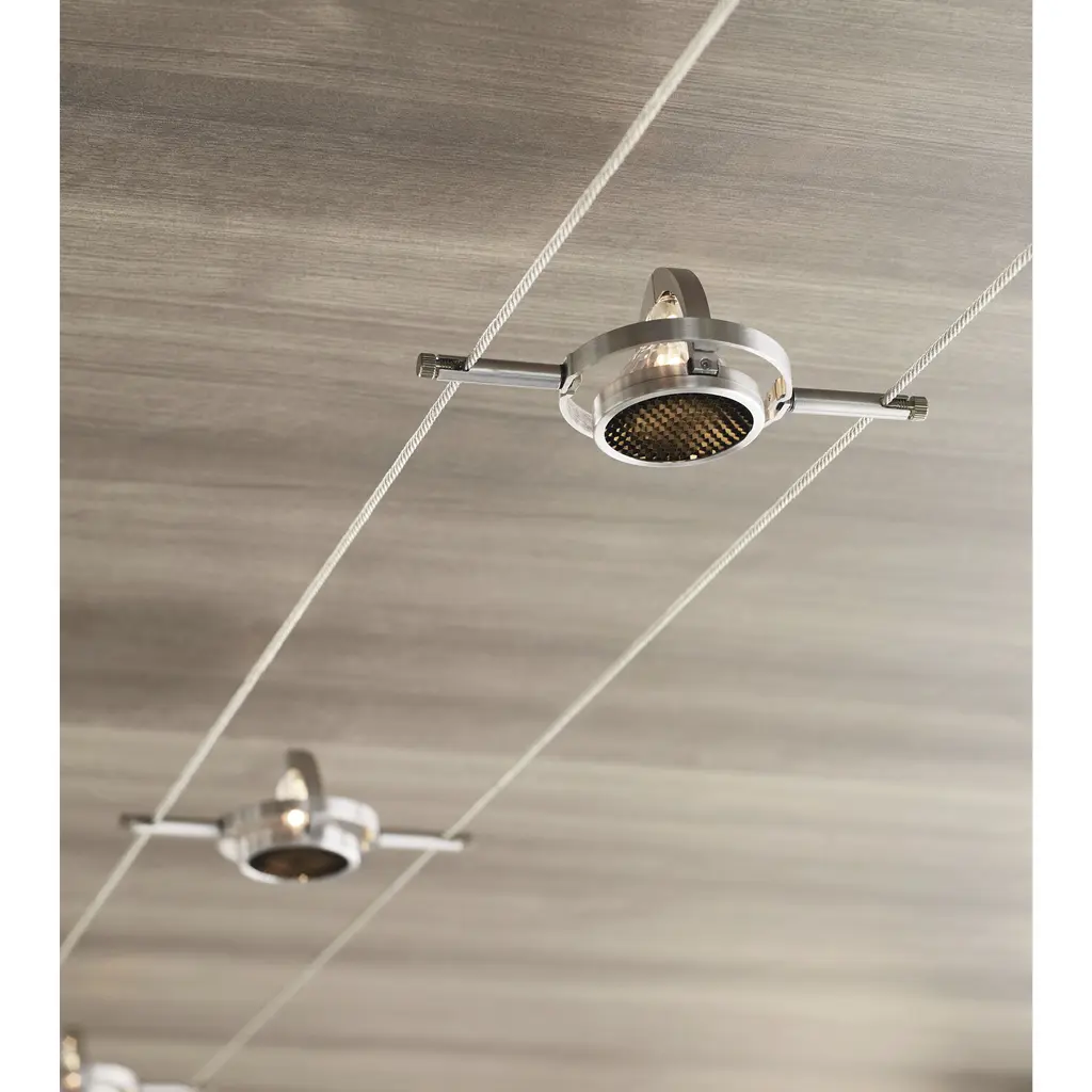 100 Watt surface transformer mounts to a standard 4" square junction box with round plaster ring (provided by electrician). Turnbuckles and anchors can be mounted to the walls or ceiling. When ceiling mounting kit, cables will drop 2" below ceiling. Includes five highly adjustable Accent heads (10 Watts max each) that tilt between the cables and rotate 120° within their rings. The kit may be dimmed with a standard MLV dimmer. Ships with 40ft of cable.