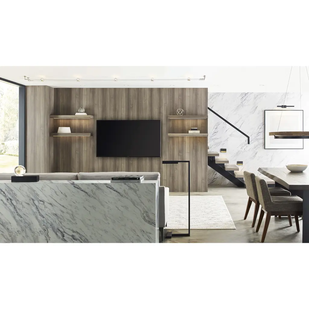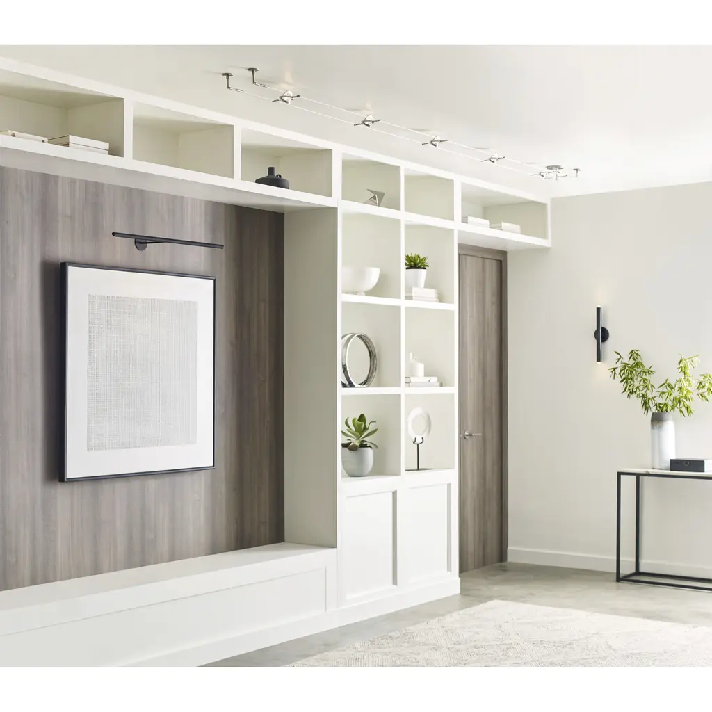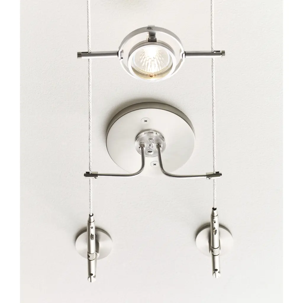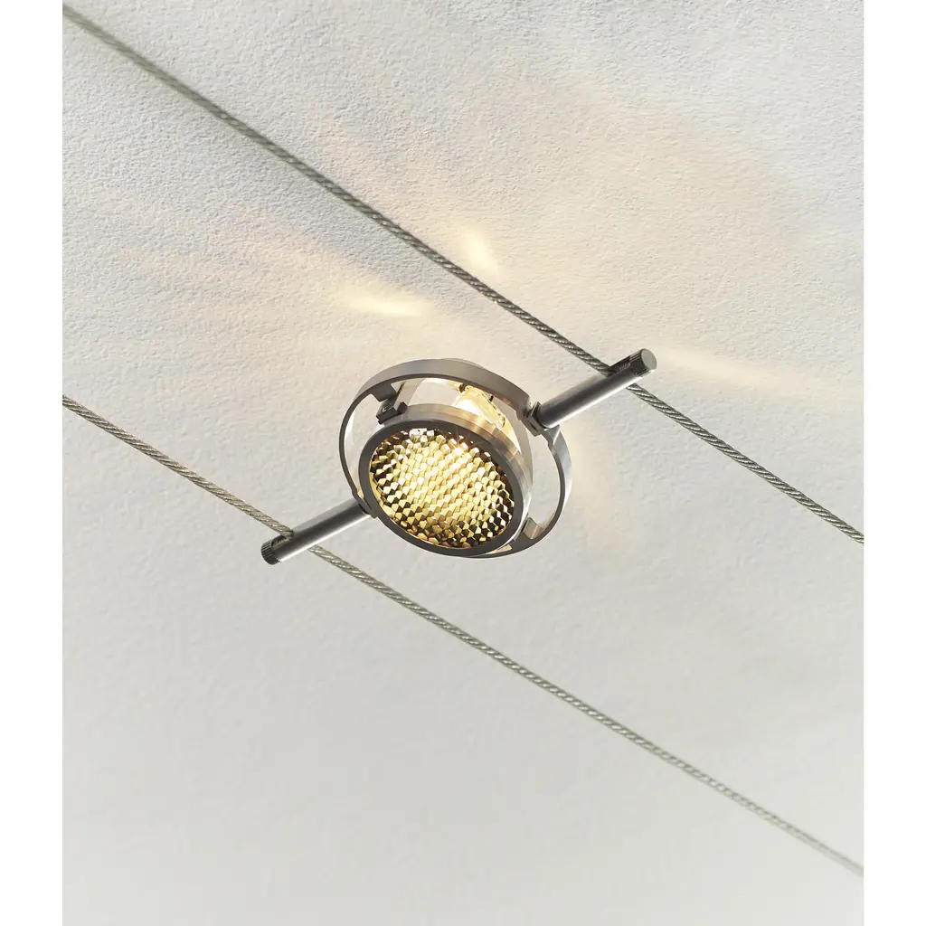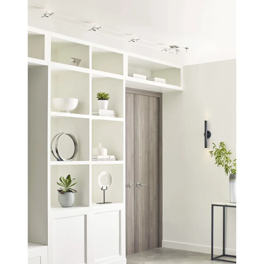 100 Watt surface transformer mounts to a standard 4" square junction box with round plaster ring (provided by electrician). Turnbuckles and anchors can be mounted to the walls or ceiling. When ceiling mounting kit, cables will drop 2" below ceiling. Includes five highly adjustable Accent heads (10 Watts max each) that tilt between the cables and rotate 120° within their rings. The kit may be dimmed with a standard MLV dimmer. Ships with 40ft of cable.