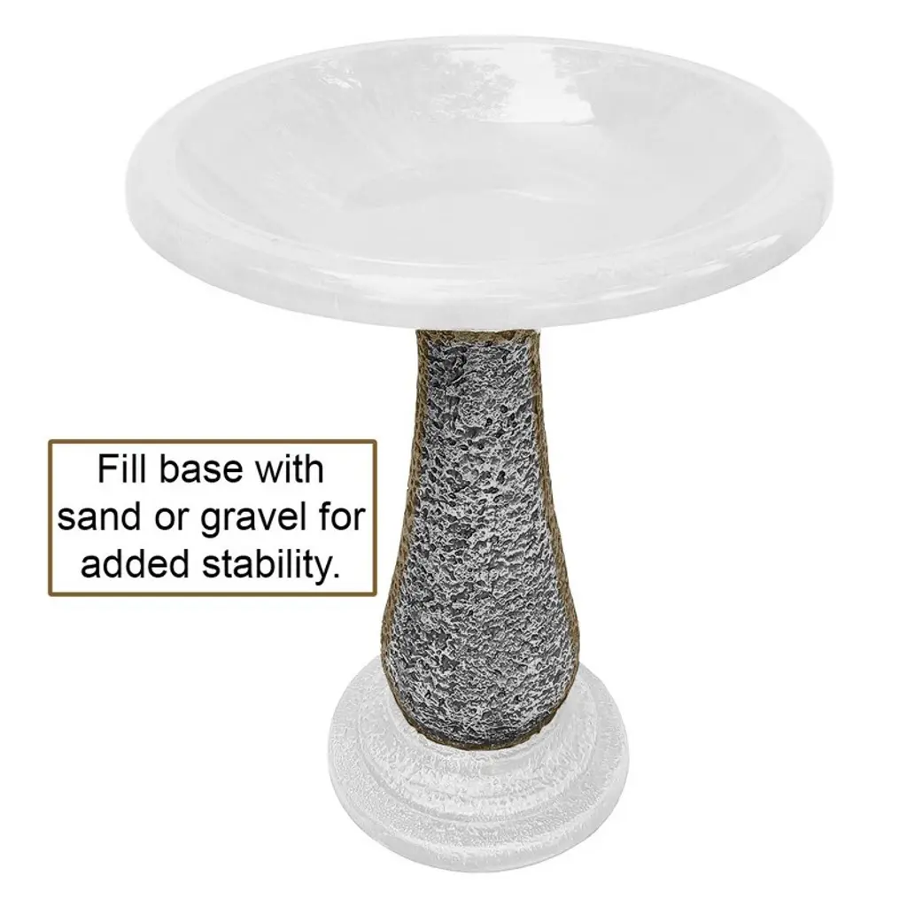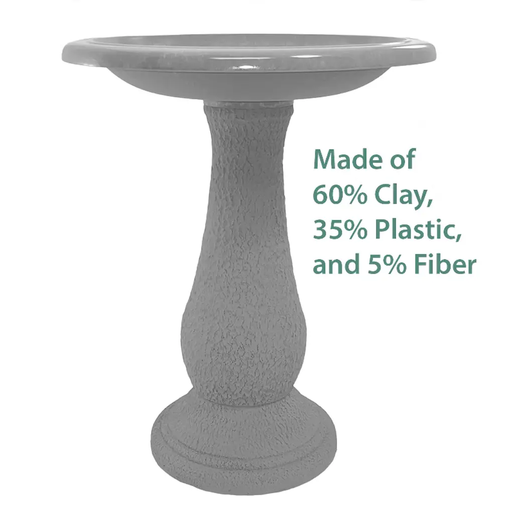This Fiber Clay Birdbath is unlike anything you've ever seen! With the beauty of ceramic and the durability of fiber clay, it will add elegance and function to any garden. It is recommended to store in an enclosed area or indoors during cold temperatures. The gloss finish on the bowl provides UV protection as well as easy clean-up and reduces staining. Clever design the hollow base can be weighted with sand for extra stability. Bowl is threaded and screwed into the base holding it secure. Quick and easy assembly. The perfect gift for the bird lover on your list! Actual product color may vary from the images shown, due to dye lot changes. Made of 60% Clay, 35% Plastic, and 5% Fiber.