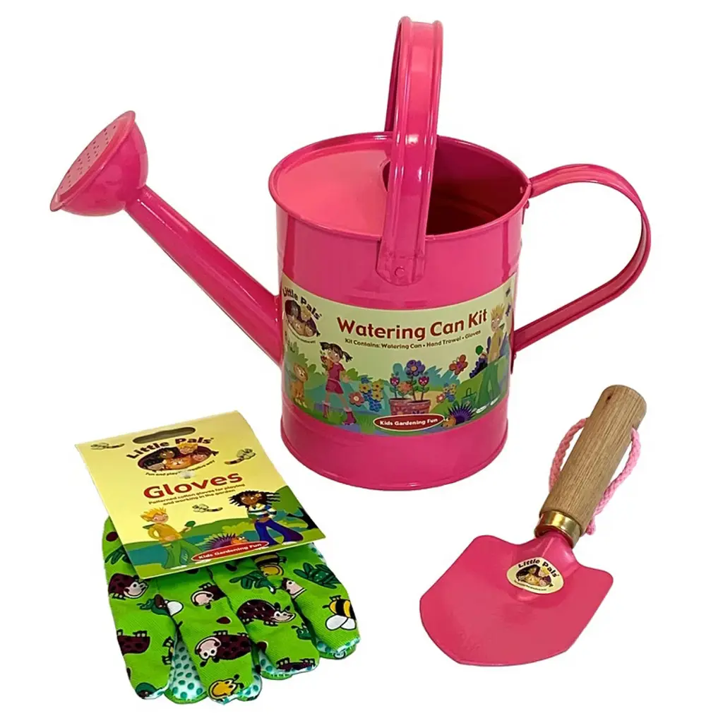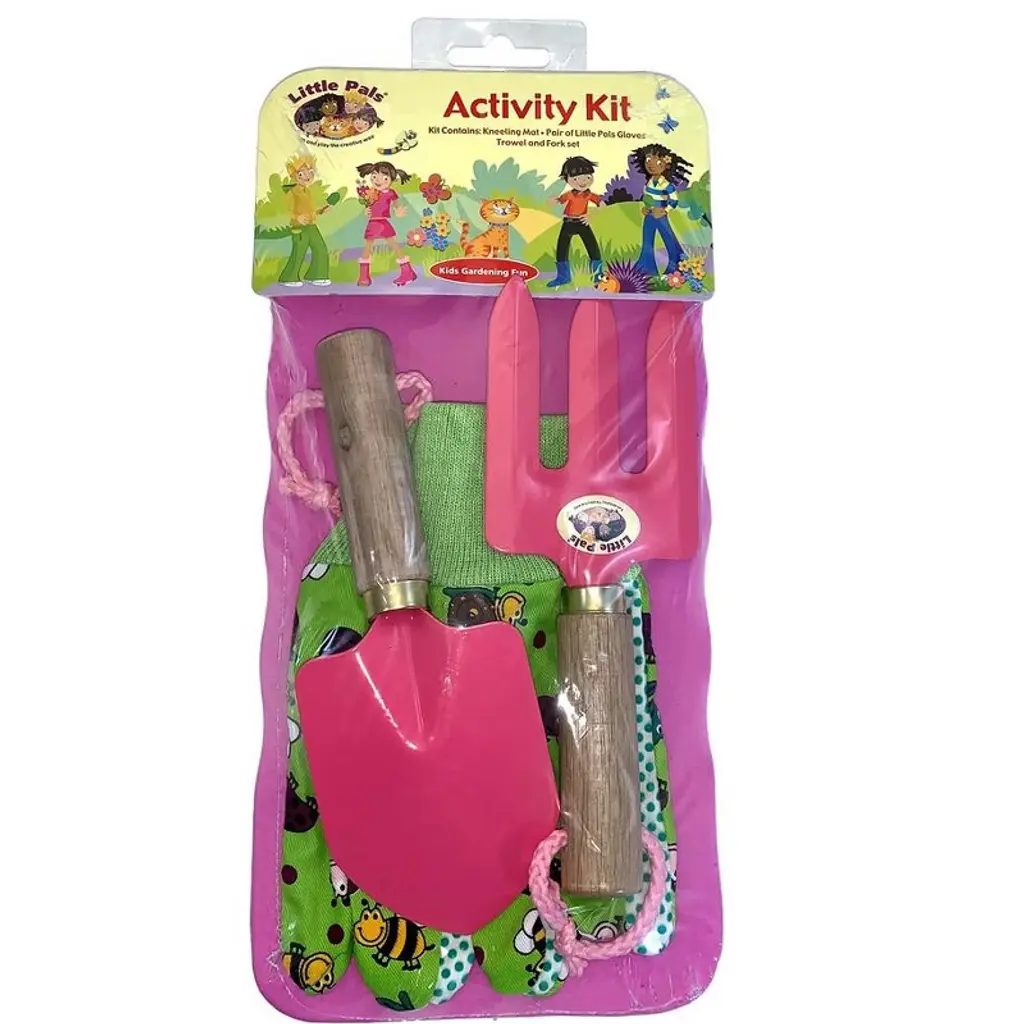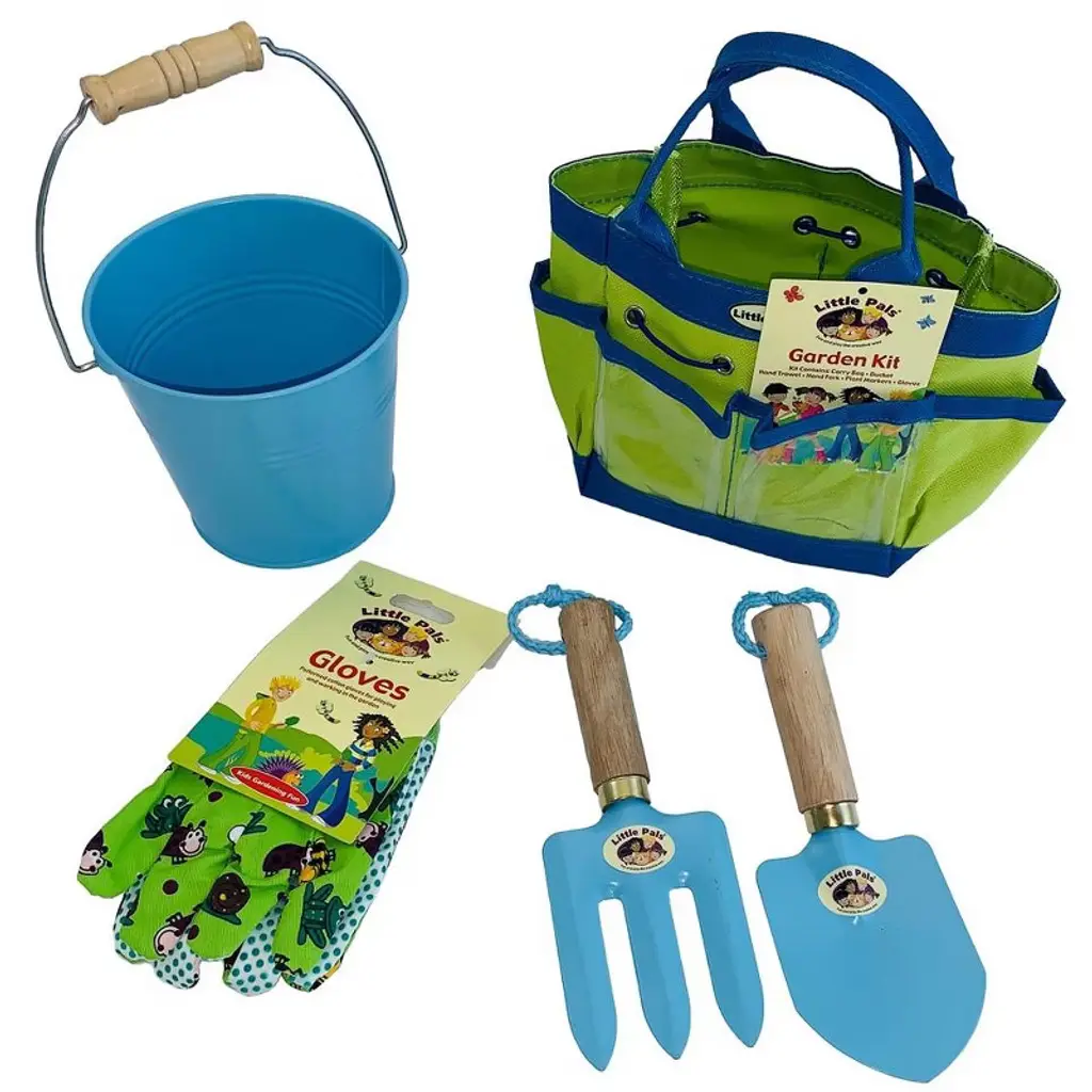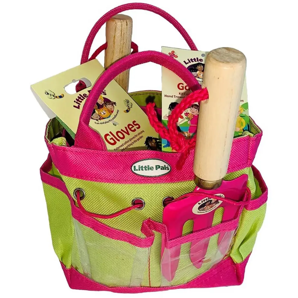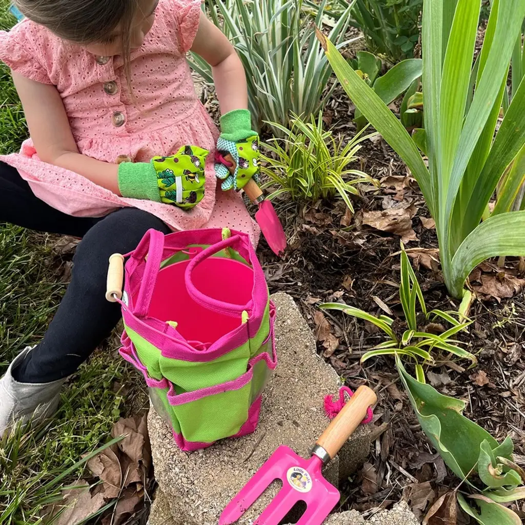 This set includes a carry/storage bag with convenient pockets, a hand trowel, a hand fork, children's gloves, two plant markers, and a matching metal bucket with a wooden handle. The tools feature metal heads and robust wooden handles. Adding to the fun are two wooden plant markers. Suitable for ages 3 to 10. Dimensions: 9"L x 7"W x 10"H; weight: 1.0lbs.
