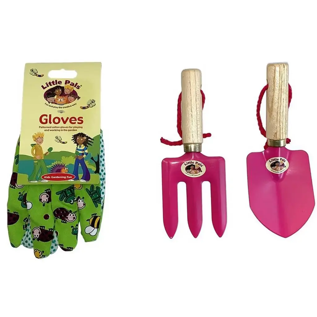 Perfect for maintaining easy access to tools during a gardening session! This set includes a green tool pouch, a hand trowel, a hand fork, and children's garden gloves. The gloves feature a wide cuff and additional fabric over the knuckles for enhanced protection of small hands. Suitable for ages 3 to 10. Dimensions: 10.5"L x 9.3"W x 2"D; Weight: 0.7lbs. Glove designs may vary.