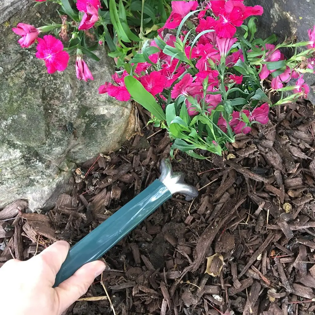 Henfeather's The Trake garden tool boasts a highly acclaimed design, celebrated for its sleek, elegant, and remarkably unique shape, making it the ultimate gardening tool. The Trake features a dual-purpose trowel and rake with a 17-inch handle, allowing use while kneeling or sitting, reducing bending and back strain. The trowel blade has permanent graduations for precise bulb and seed planting. Its handle angle provides leverage for digging or cultivating, and the rake end is slim enough for narrow rows and tight spaces. The ergonomic handle is designed for bidirectional use. The terradynamic trowel design easily penetrates soil, complemented by a non-slip vinyl-coated shaft. Made from solid die-cast alloy, it resists rust, bending, and distortion. Dimensions: Head: 6"L x 2.5"W, Total: 17"L; Weight: 1lb. Includes Prop 65 Warning.